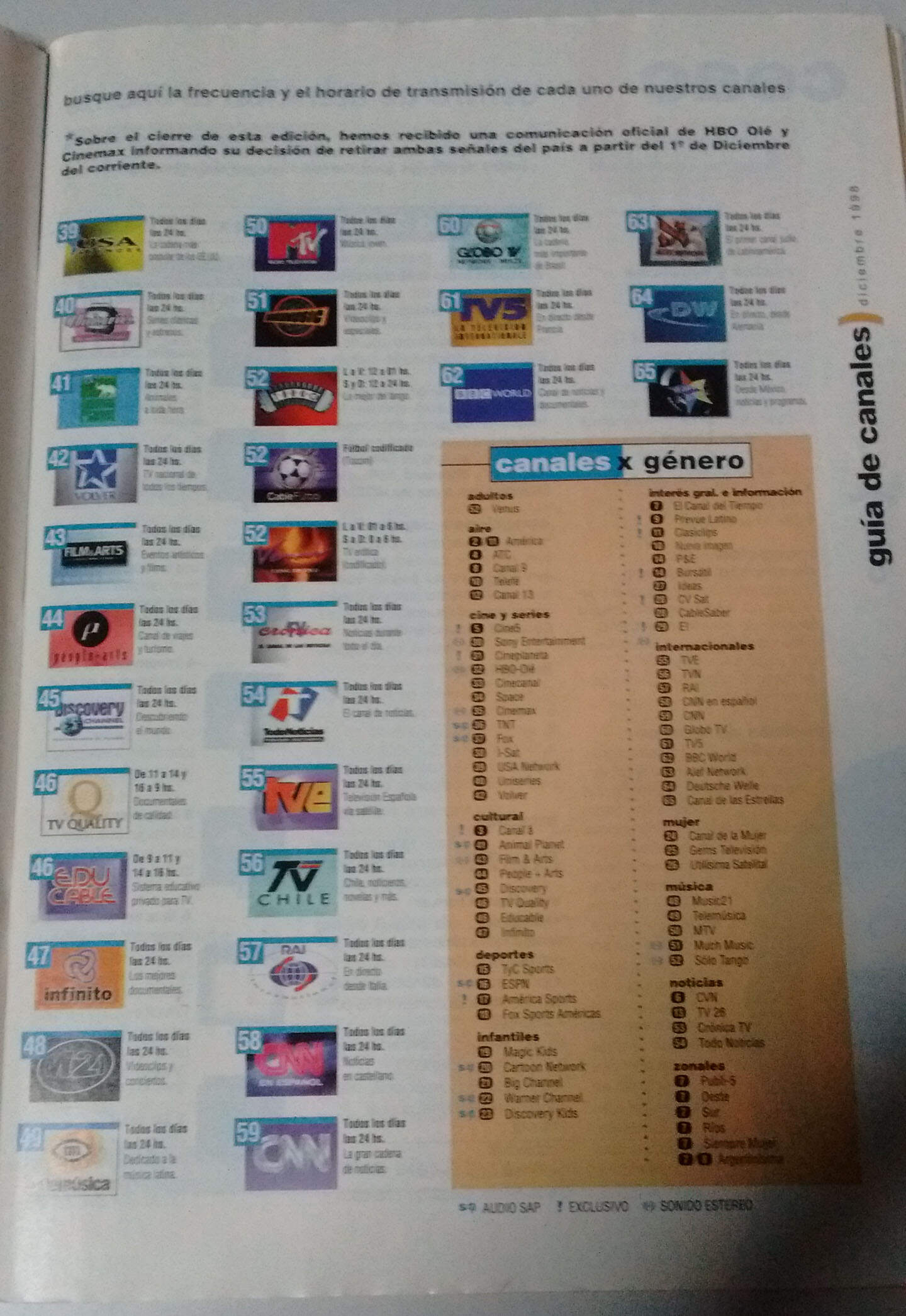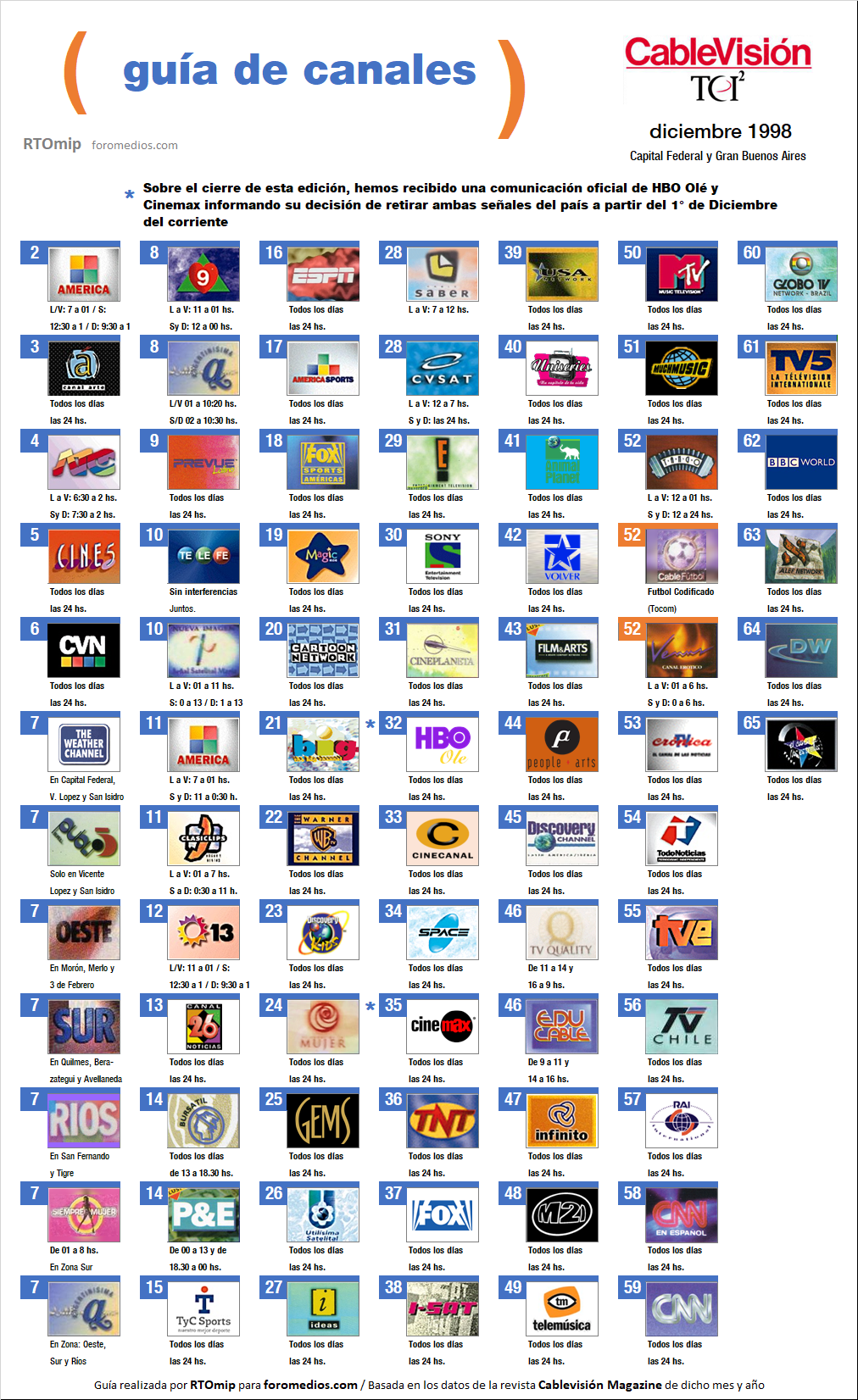 Continuamos con este viaje en el tiempo y llegamos a un mes bisagra en la historia de la TV por cable… Diciembre de 1998, mes en el que HBO anuncia que retira los canales HBO Olé y Cinemax del abono básico de todos los cables argentinos. Aquí, Cablevisión anuncia en su guía de canales dicha decisión de la distribuidora. Estas salidas provocarán varios cambios en la grilla, que se podrán ver en la guía del mes siguiente.