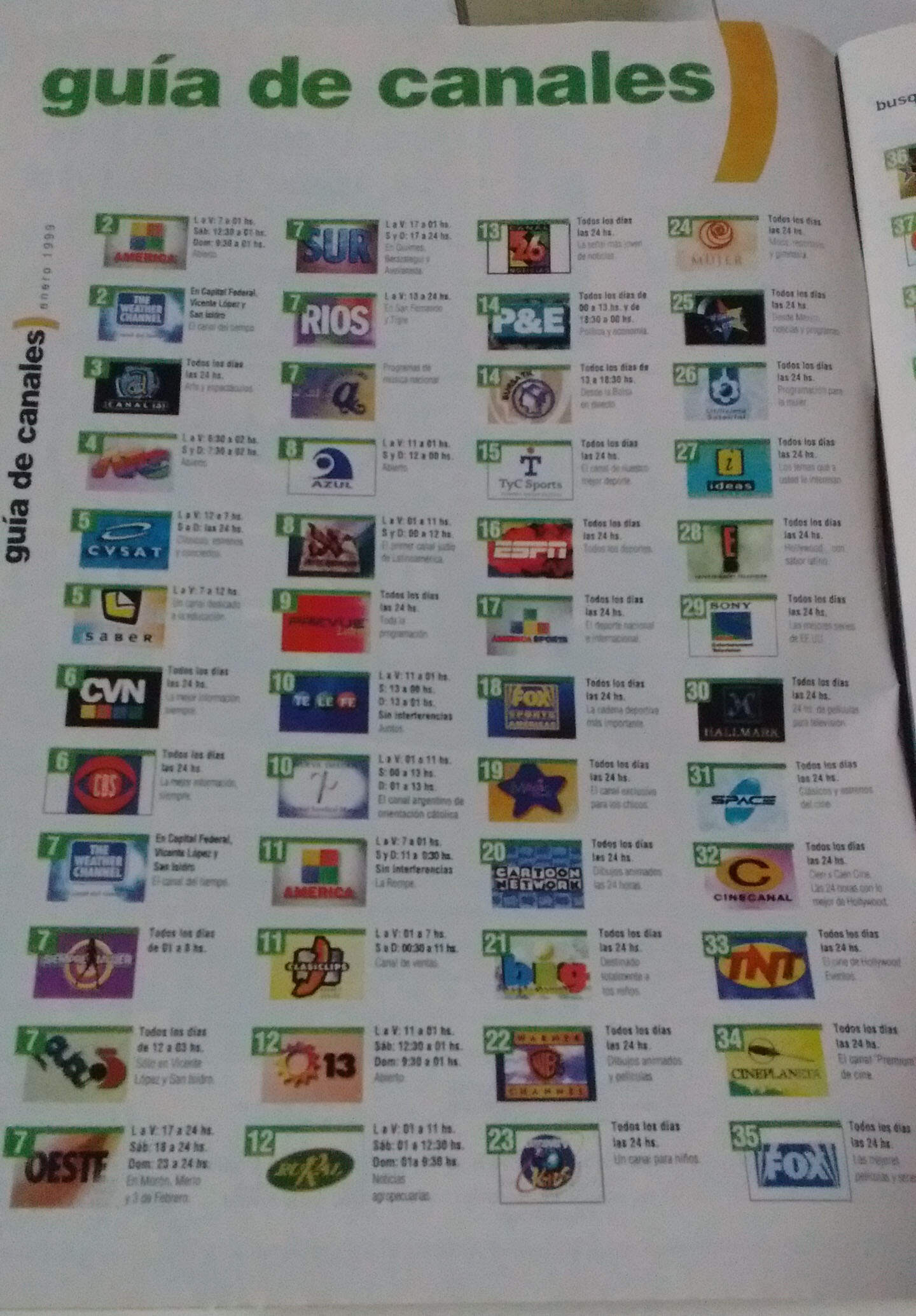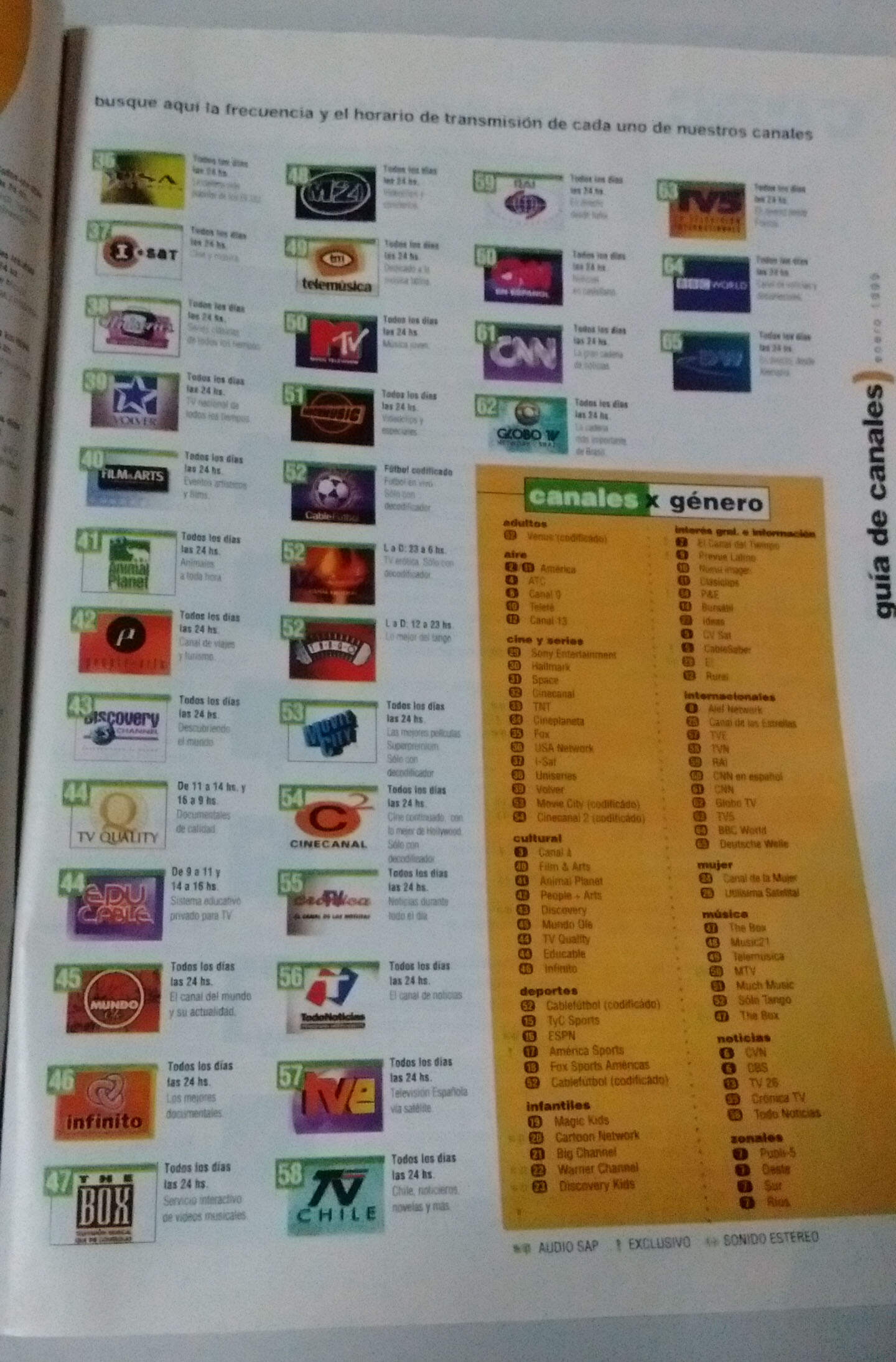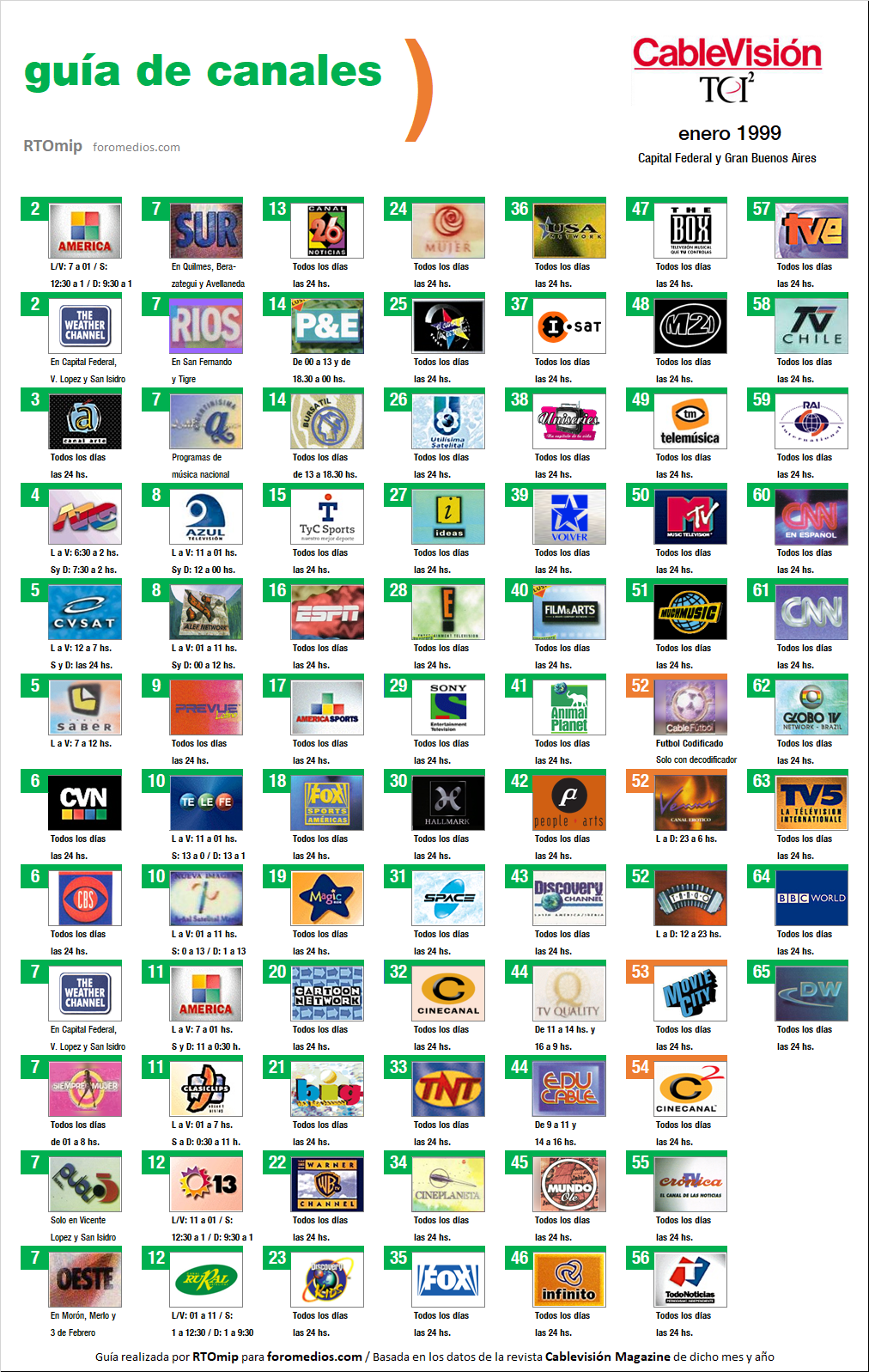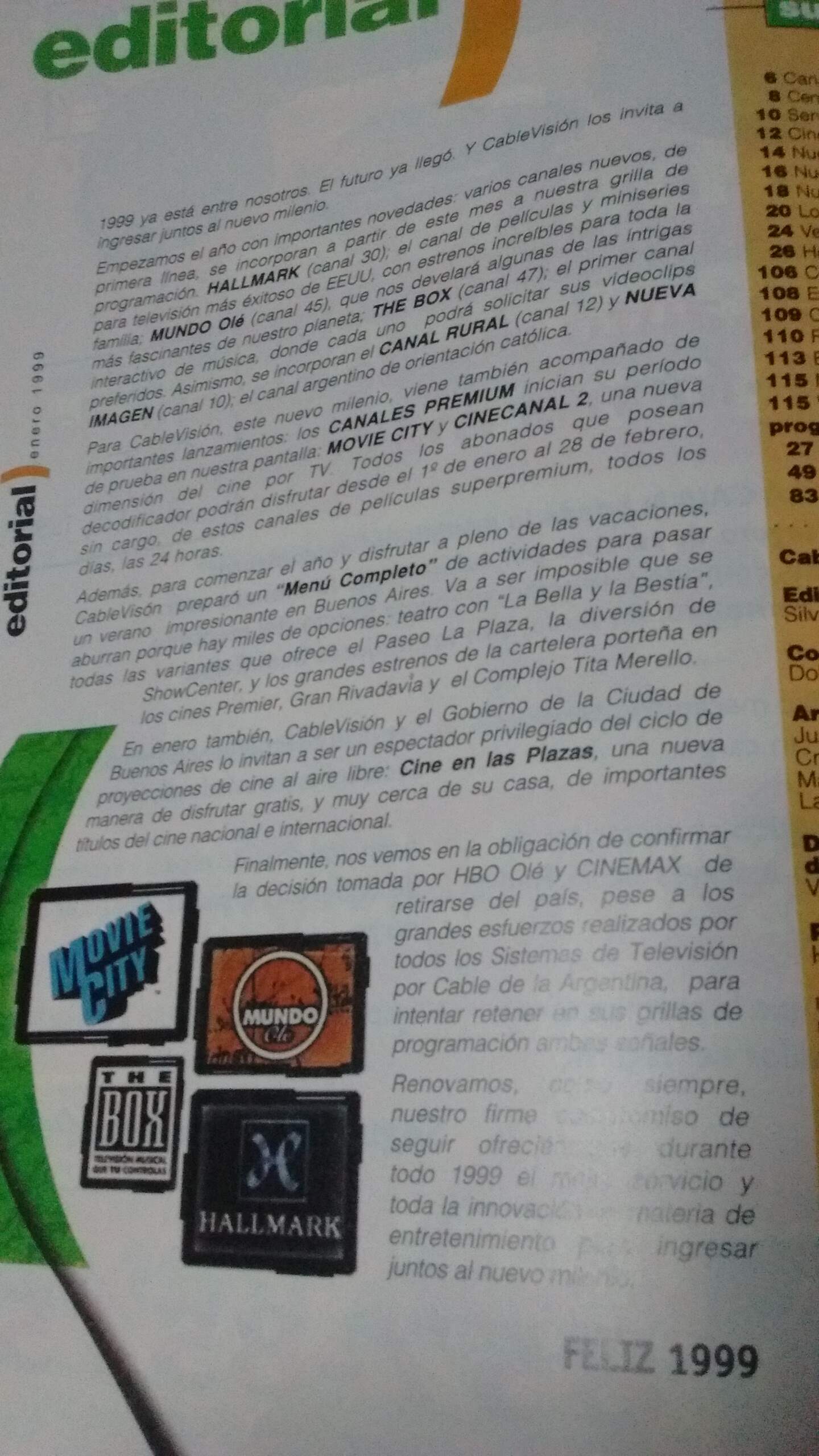Luego de que Cablevisión, como así los demás cables del país, recibiera el golpe duro de perder las señales de HBO Olé y Cinemax, se vieron obligados a reorganizar toda su grilla, y así quedó su alineación al momento de recibir al año 1999