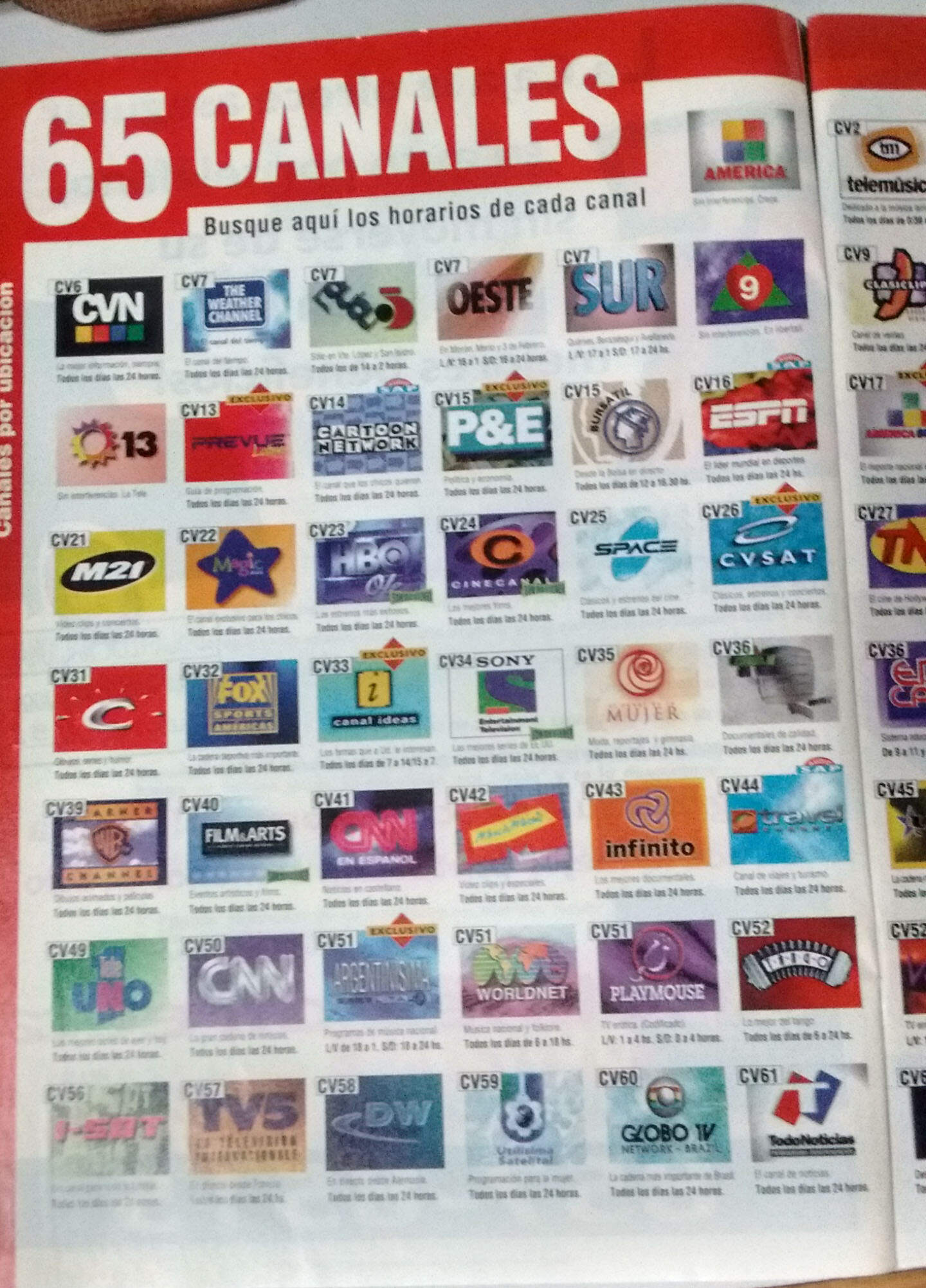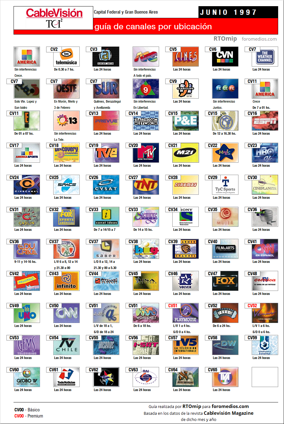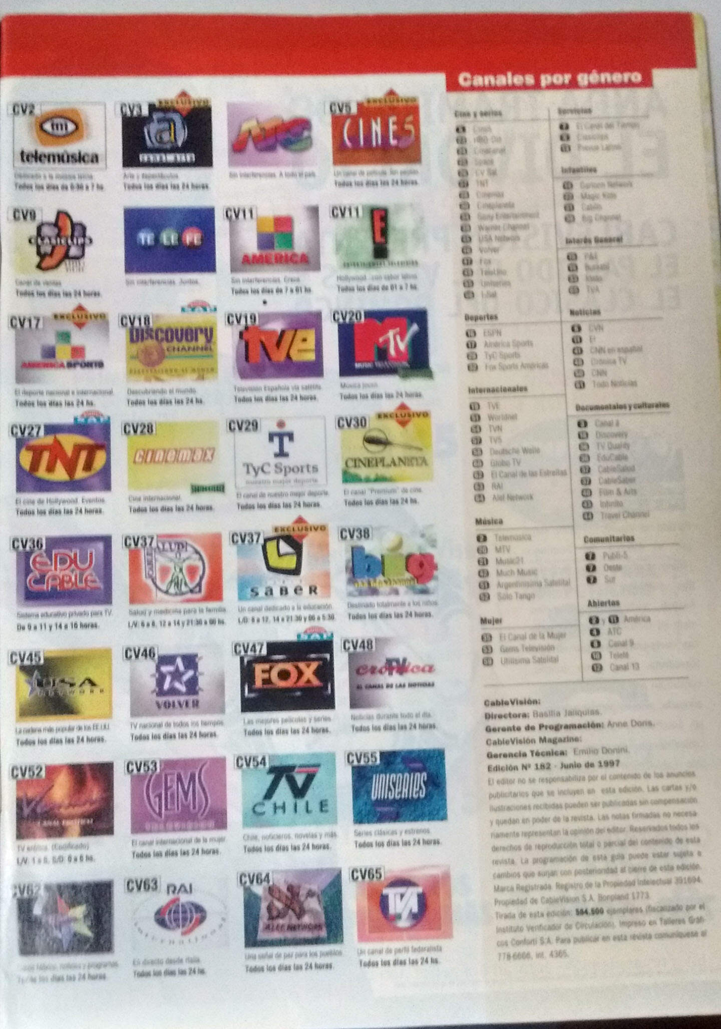 Tras el suceso de la publicación de ayer con la guía de canales retro de Cablevisión, les traigo hoy la grilla del mes siguiente, Junio de 1997, en la cual no hay mucha más novedad que el renombramiento de Cinevisión como Cineplaneta (hoy Europa Europa) en la señal 30.