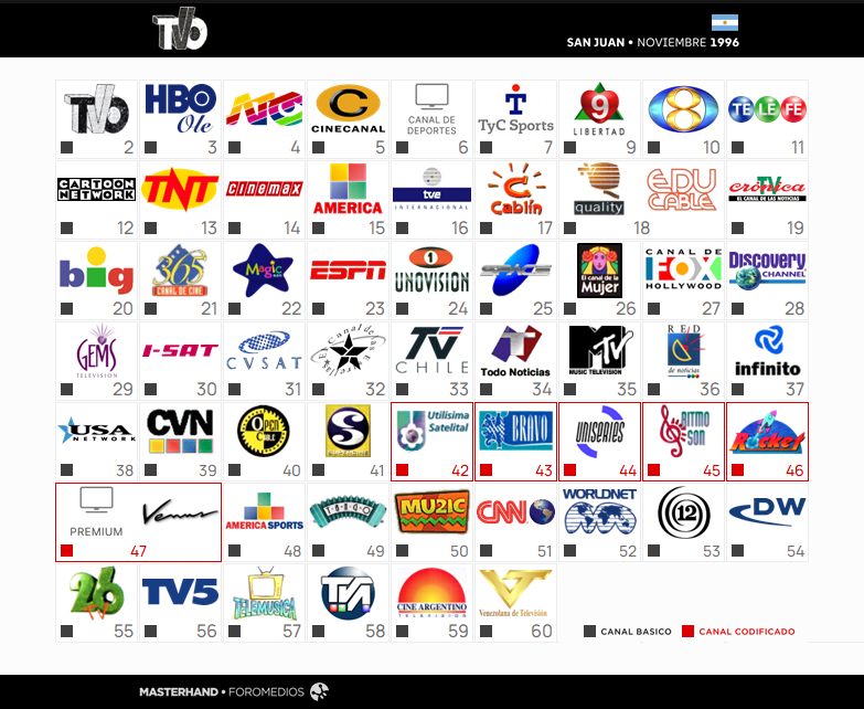 Realizada con información extraída del Diario de Cuyo, que publicaba todos los días el orden de los canales de esta empresa (luego absorbida por Supercanal). Si mal no recuerdo, TVO y Diario de Cuyo eran del mismo dueño.
