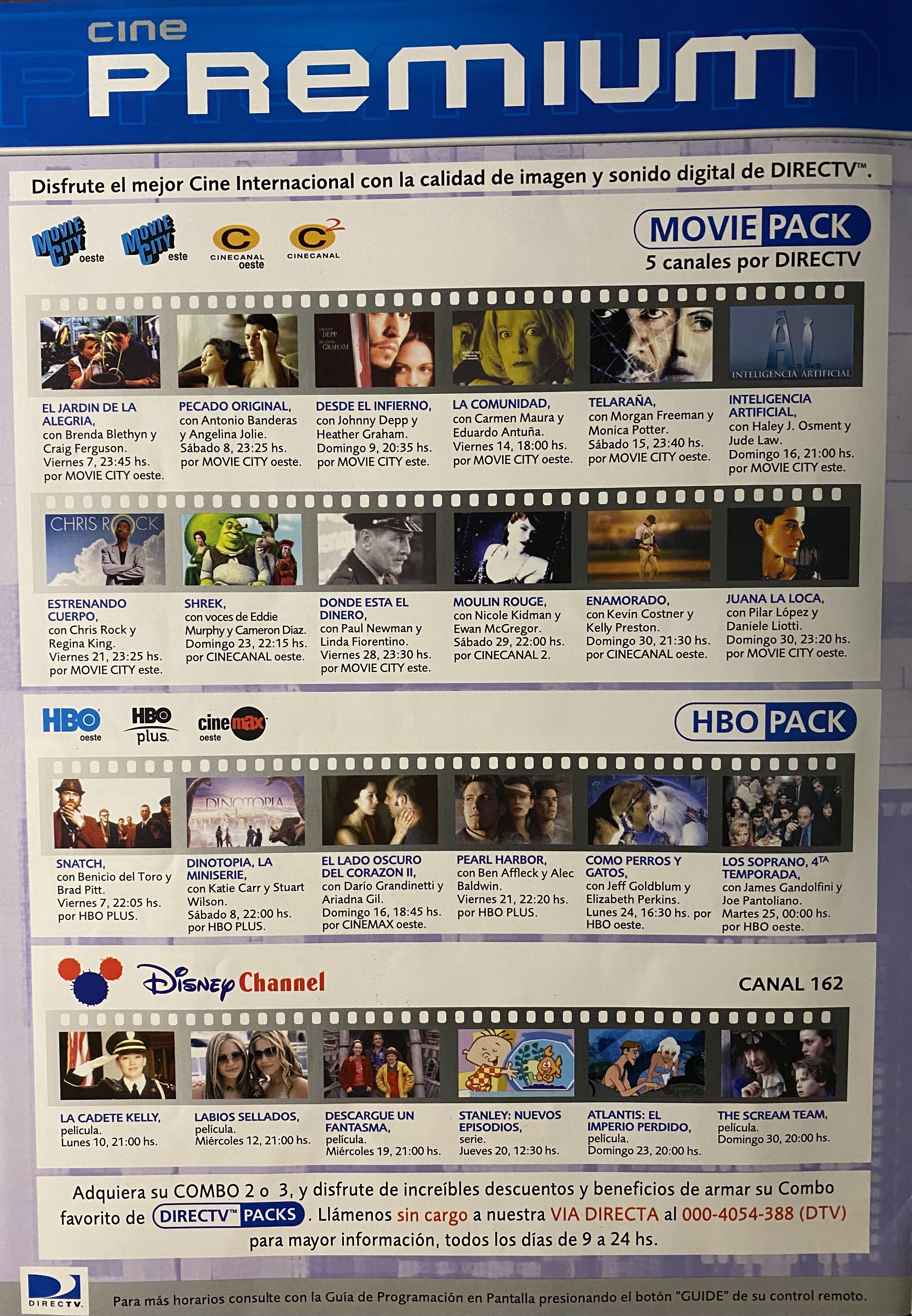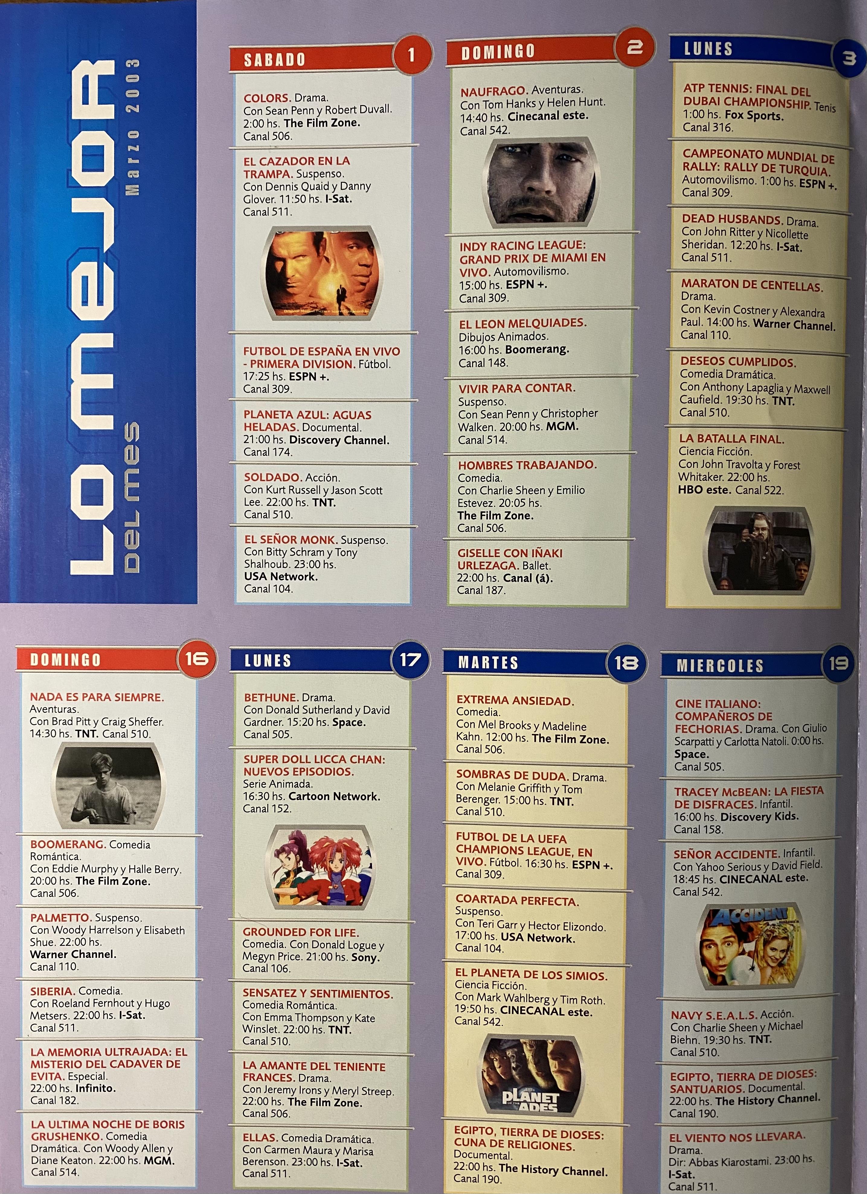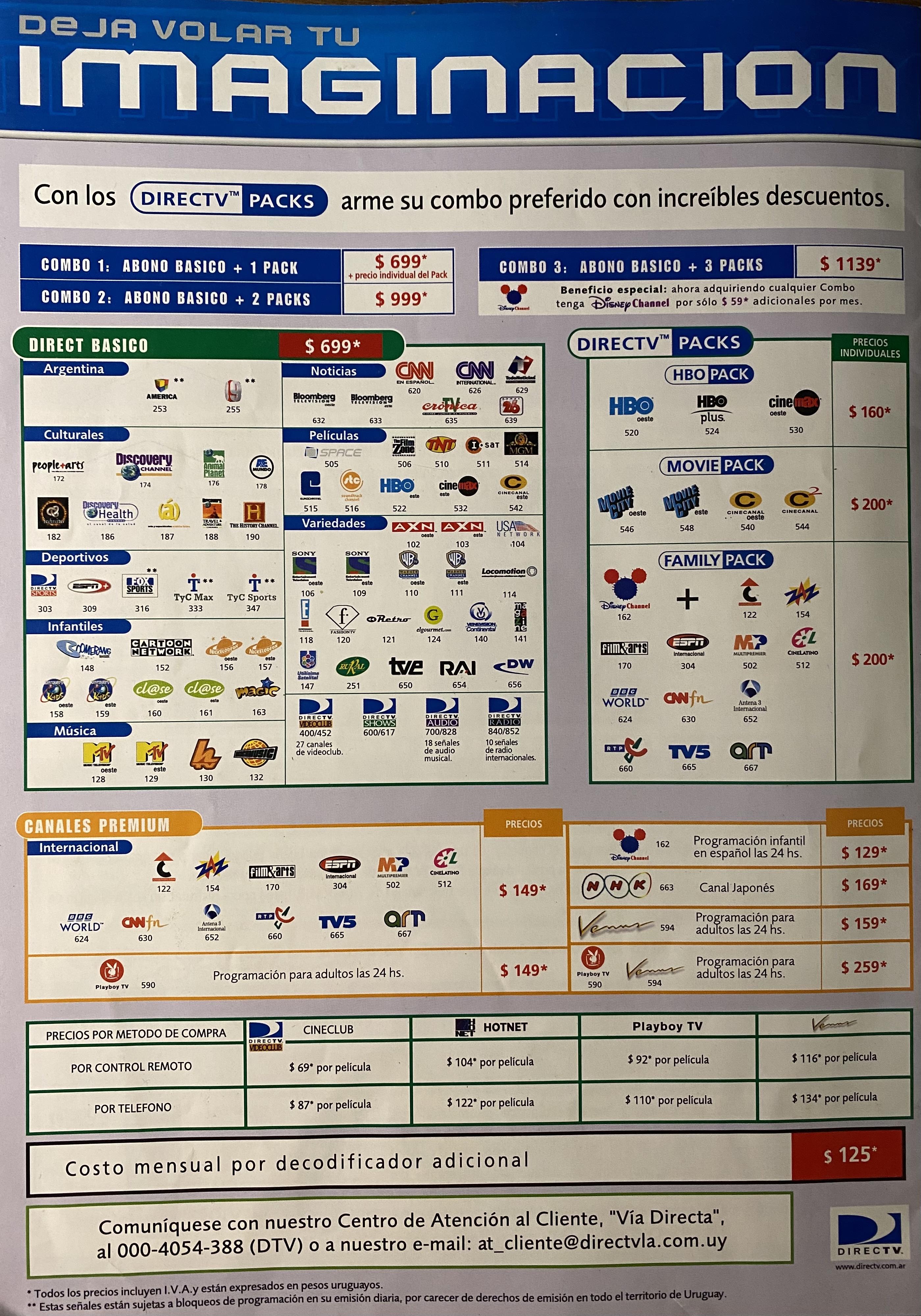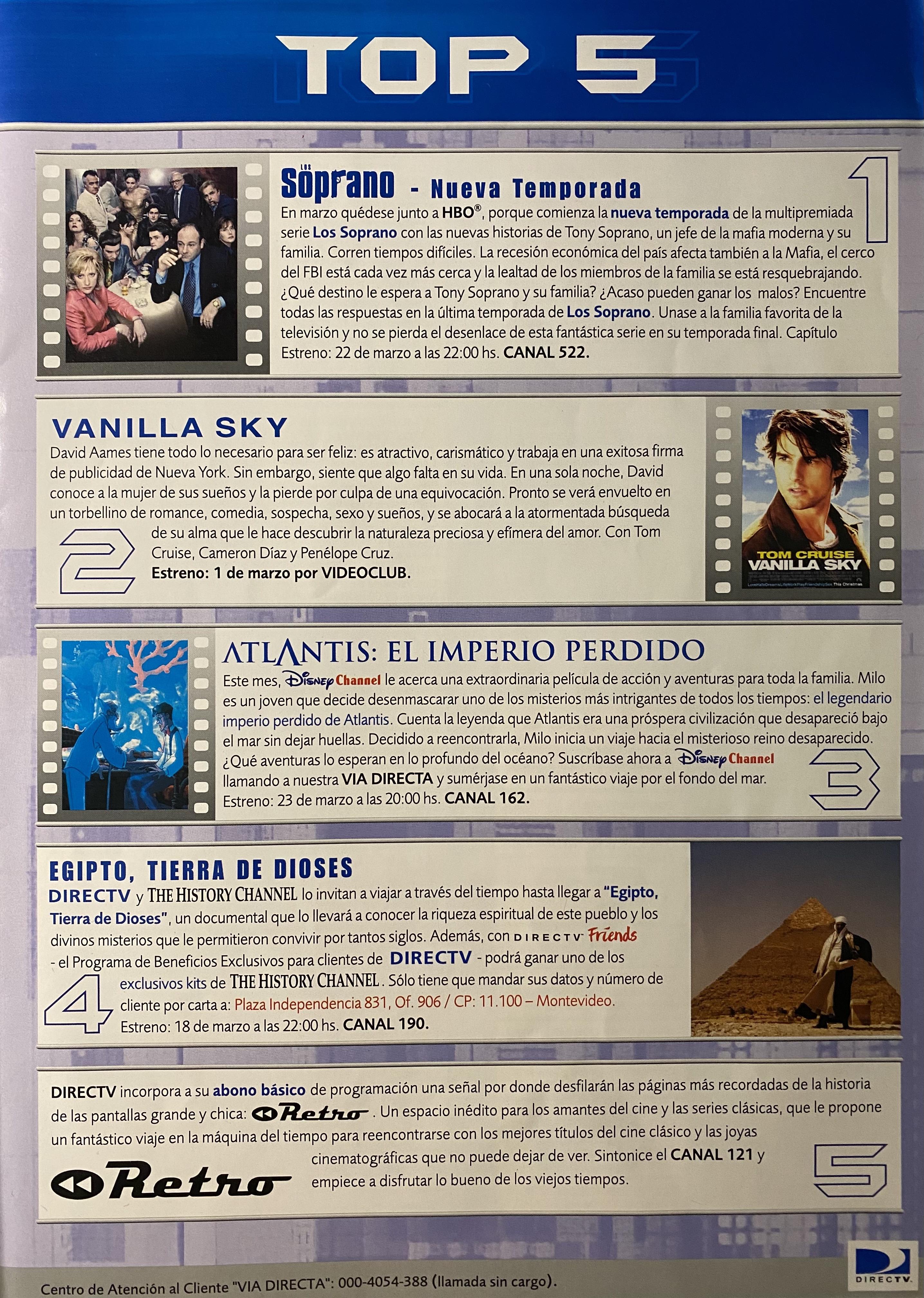 Ajunto imágenes de la comunicación mensual exclusiva para abonados, de Directv Uruguay de marzo 2003, que contiene la grilla de canales.