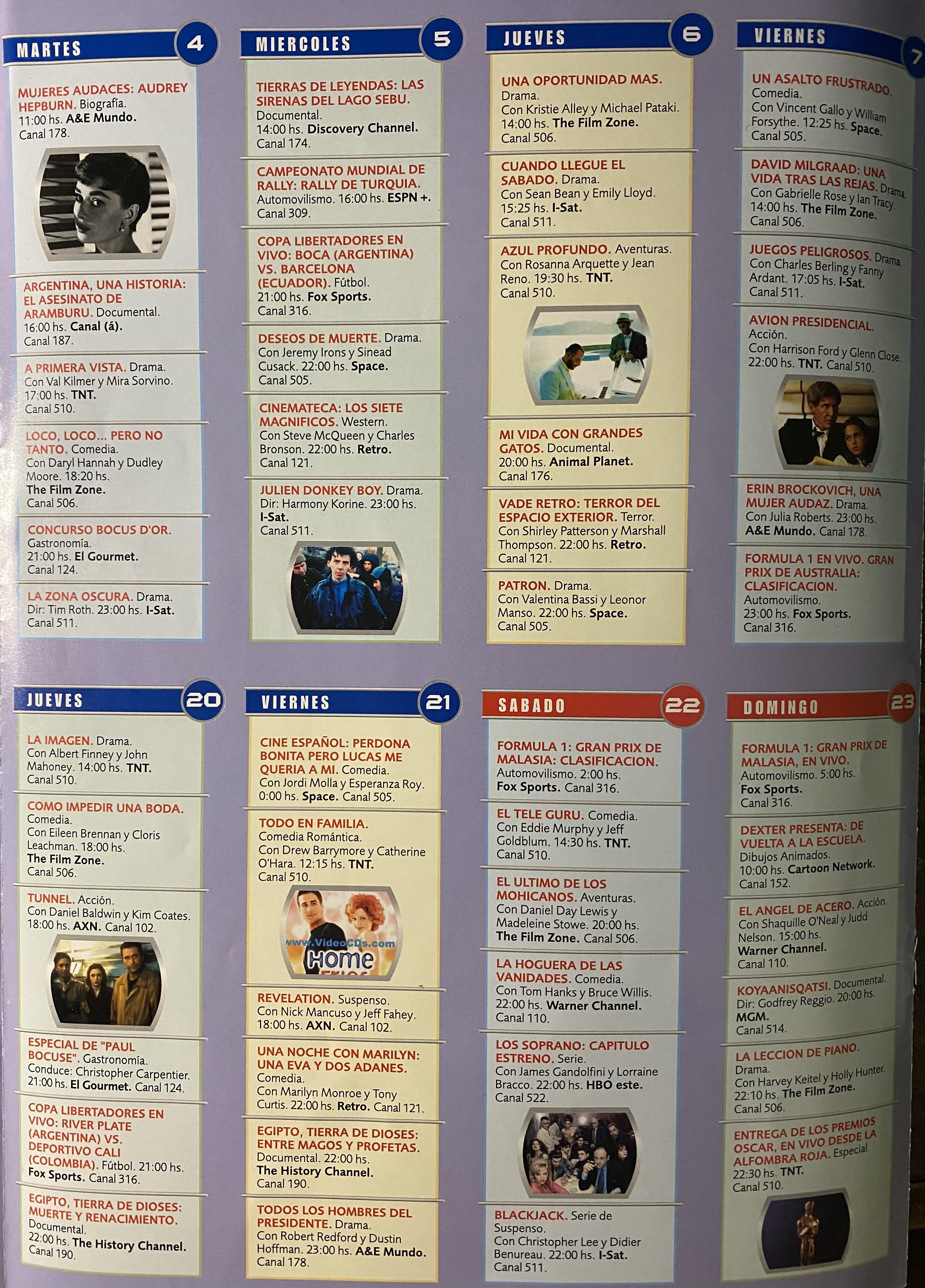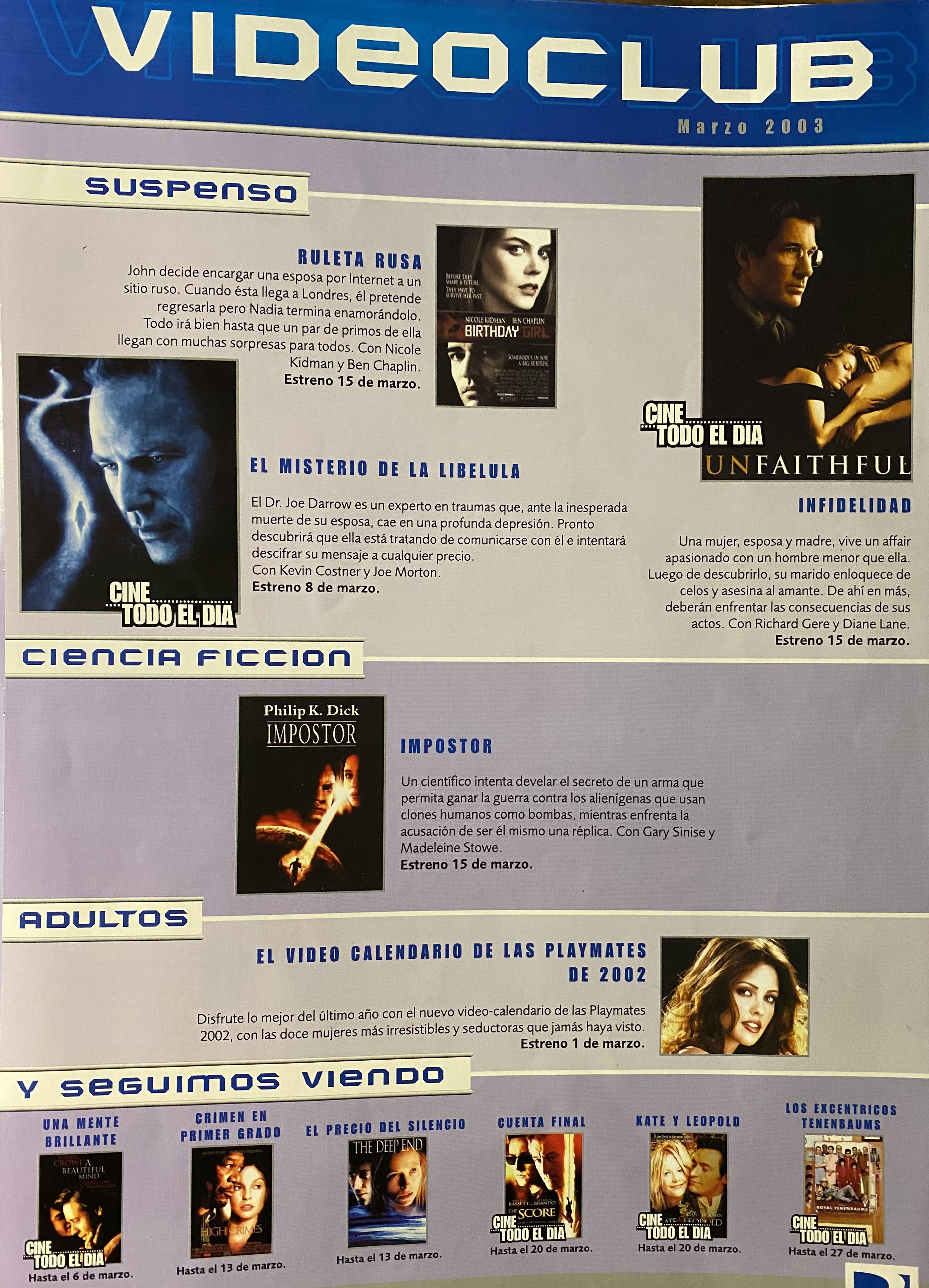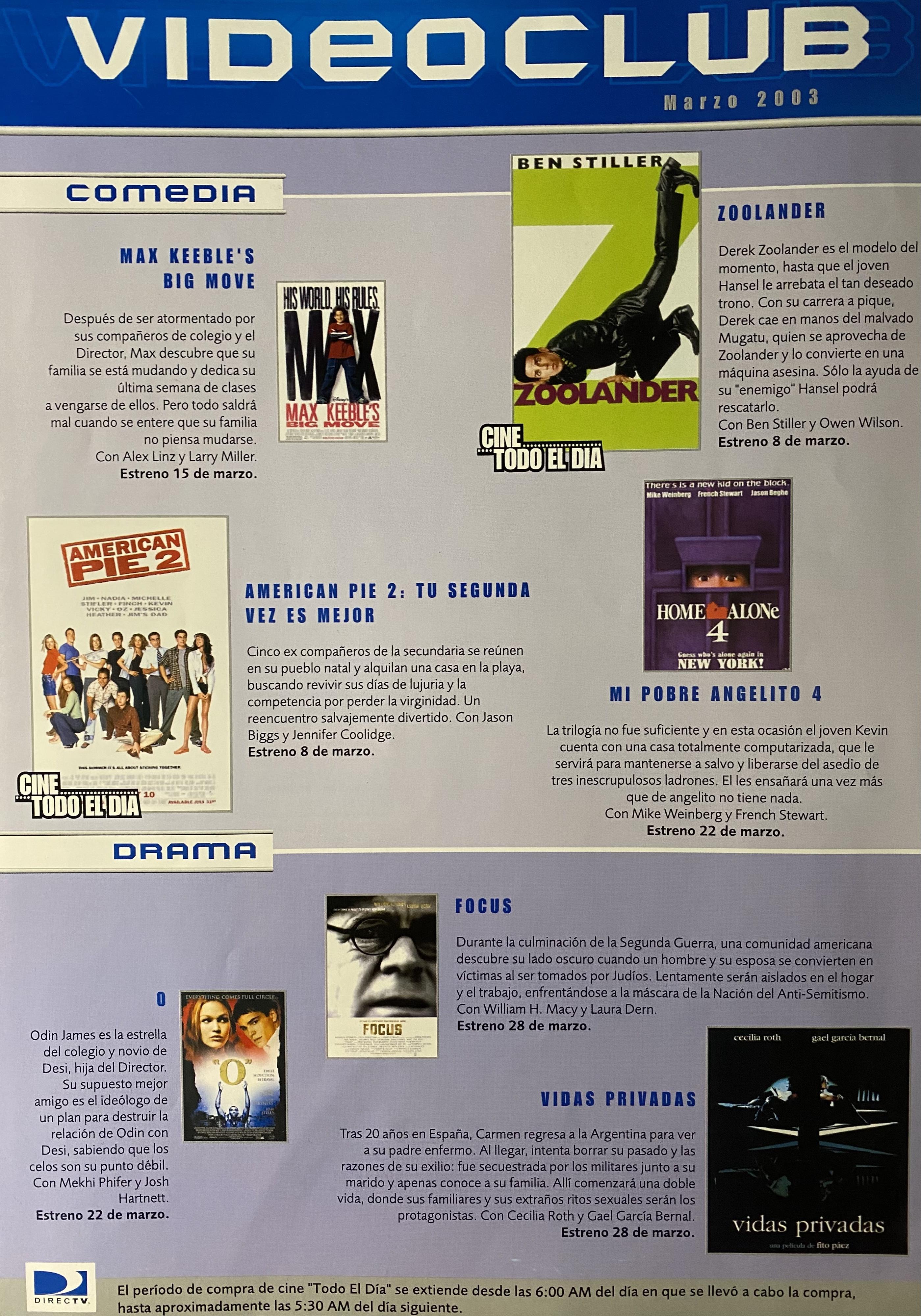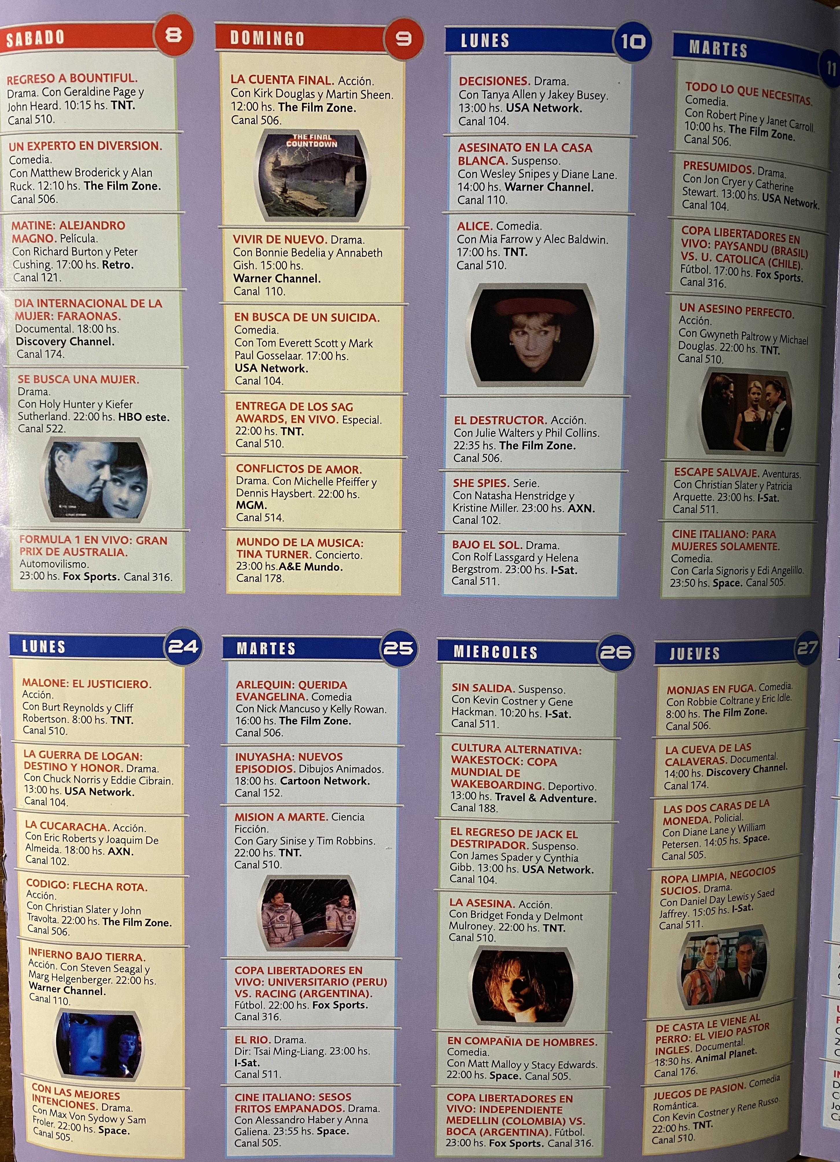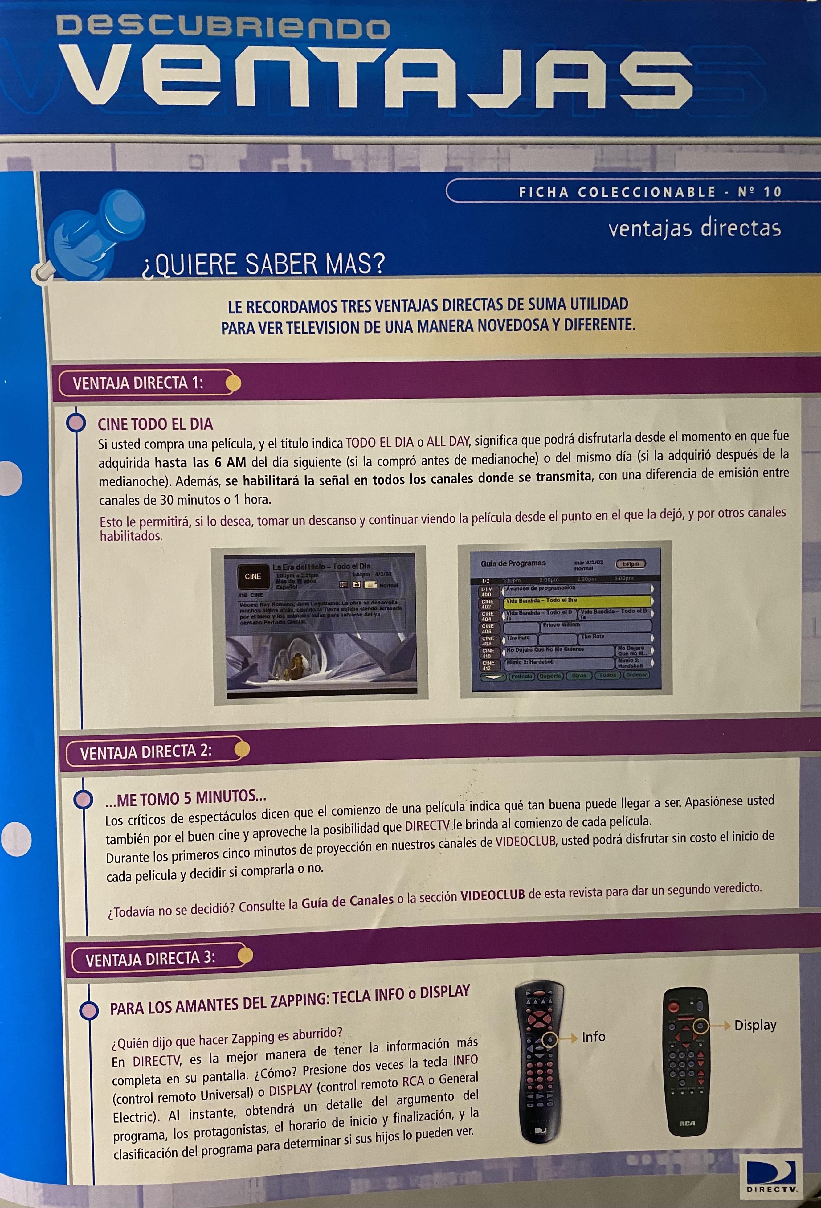 Ajunto imágenes de la comunicación mensual exclusiva para abonados, de Directv Uruguay de marzo 2003, que contiene la grilla de canales.