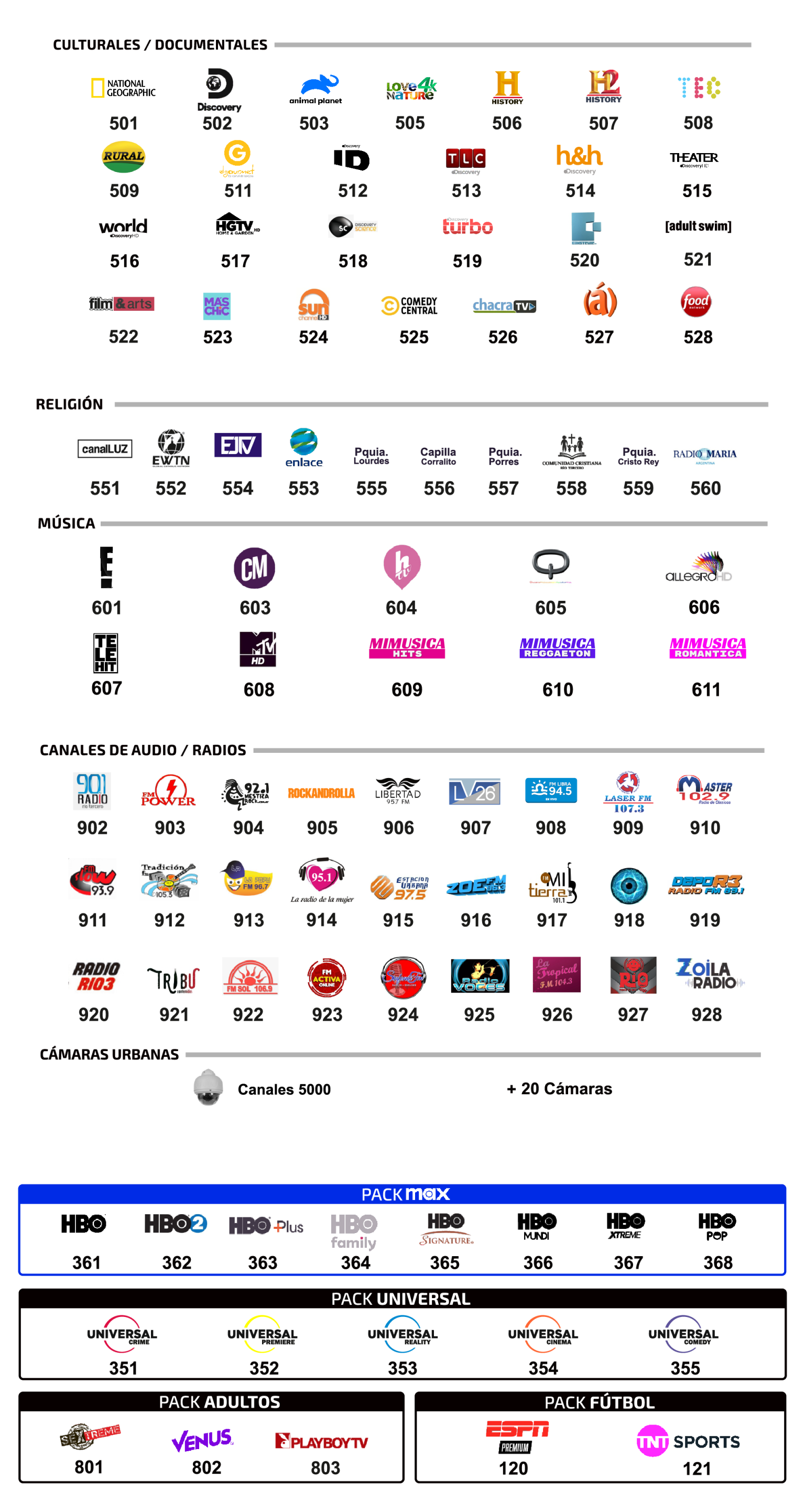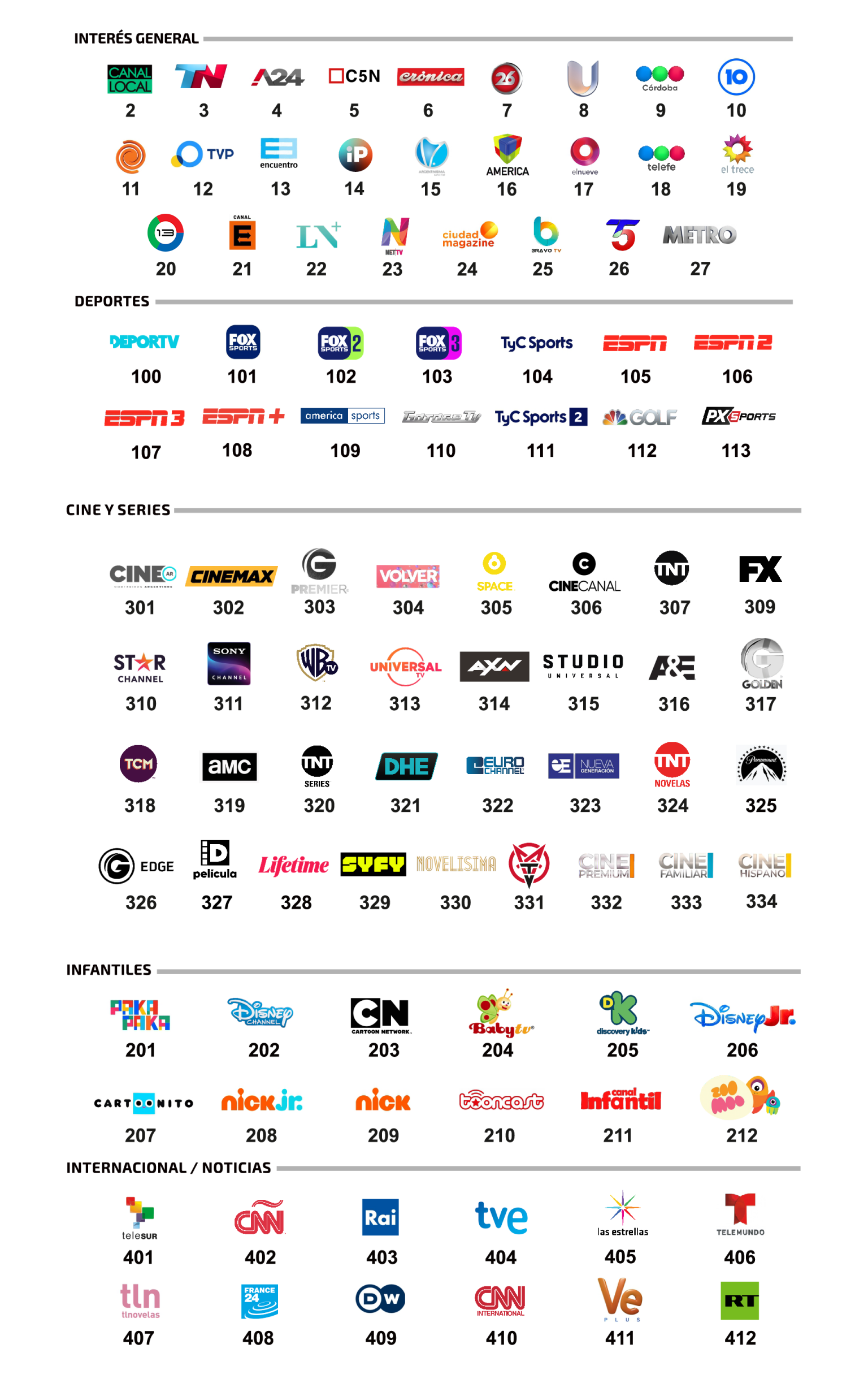 hace 11 horas, Tío Sopaipilla dijo:A pedido de nadie, esto es la grilla de canales de Riotel, la cablera de la Cooperativa de Obras y Servicio Públicos de Rio Tercero. Aunque modificado por razones obvias (y sip, la grilla fue encontrado en la página web, con algunos errores), pero el mayor problema es… notar por los logos desactualizados. Y con supuestos canales raros como… canales de las parroquias o las radios locales de dicha ciudad (¿quién pidió esto?). Aunque desconozco si se parece mucho a una grilla de Sensa.