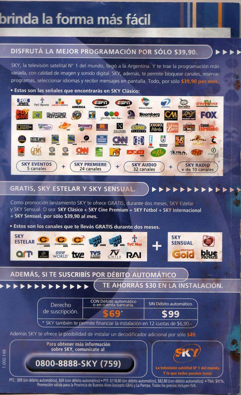 La oferta inicial de canales de Sky Argentina (que pasó sin pena ni gloria) para su lanzamiento en 2000. Que aún se desconoce los diales de los canales.