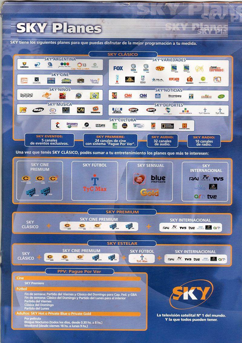La oferta de canales de Sky Argentina (que pasó sin pena ni gloria) en el mes de Junio de 2001. Que aún se desconoce los diales de los canales. Crestomatía: un post de un grupo (TV Historia) de Facebook por otra persona, del 2014.