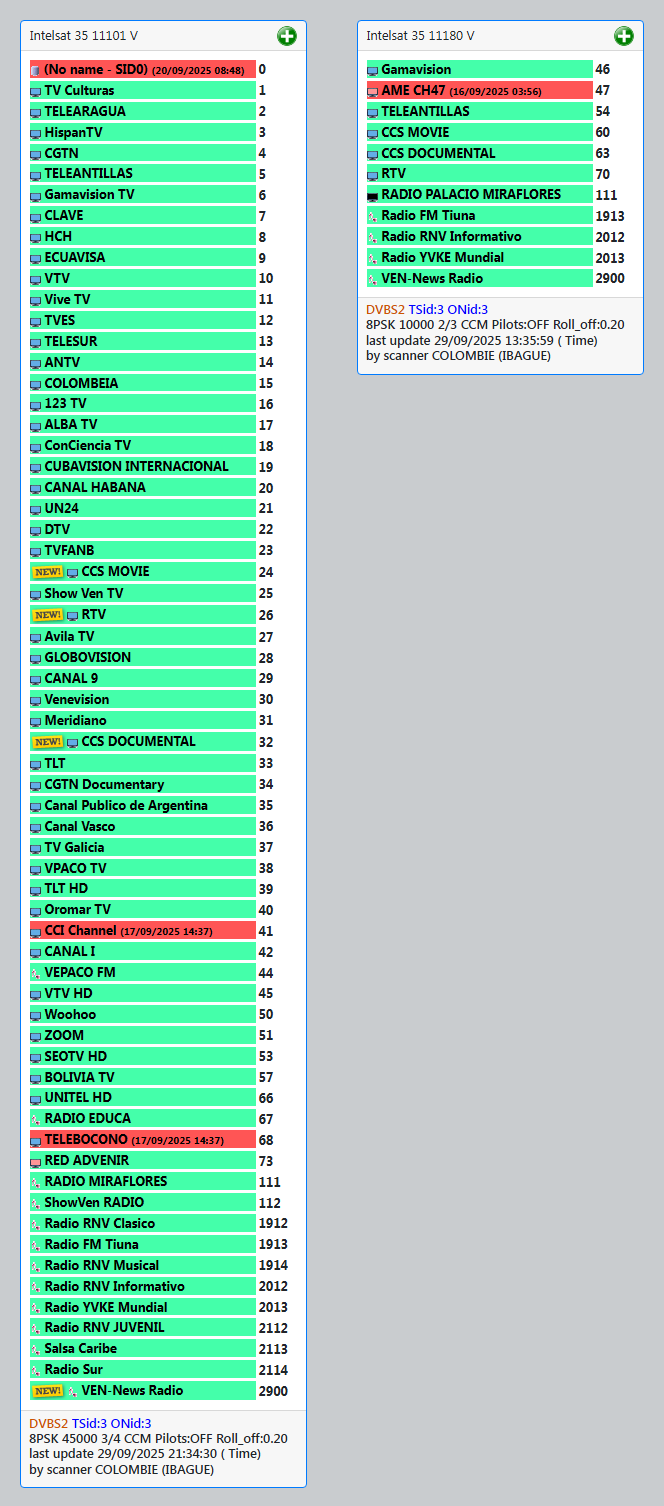 Así lucen los muxes de FTA Venezuela que están en el Intelsat 35 según DigitalBitrate, a pesar de todas las inventadas que quería colar @Msua, sí ha habido movimientos reales ingresando algunos duplicados de canales que están en el transponder 11180V al 11101V (el principal), para ser exactos 3 canales (los 2 playlist CCS y el hondureño RTV) y 1 radio-visual (VN Radio), salen el canal religioso hondureño CCI, el dominicano Amé 47 y el regional Teleboconó (que como su señal al parecer dependía de su señal en vivo por streaming, anduvo más tiempo caído o en “barras de ajuste” que activo).