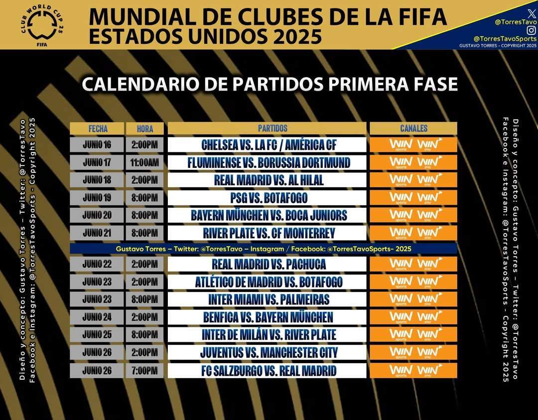 COLOMBIA: El canal temático nacional Win Sports también transmitirá algunos encuentros de la Copa Mundial de Clubes de la FIFA. Esta es la lista de horarios confirmados.