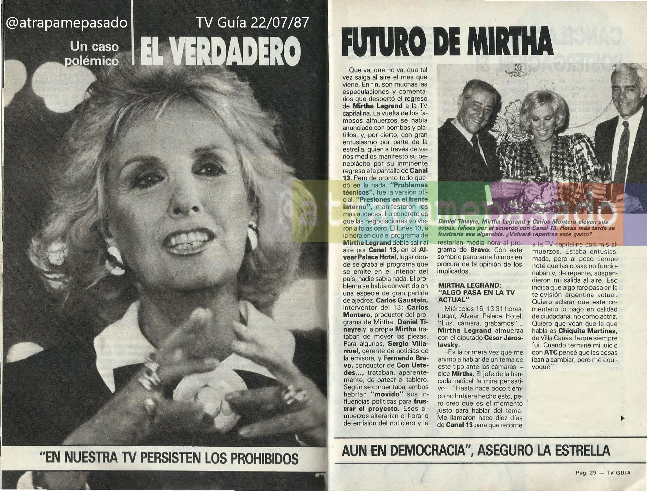 El conflicto, según Wikipedia: "En 1981 el programa no se emite, pero Legrand firma contrato con ATC —que en ese momento estaba en los primeros lugares de audiencia— para emitir los almuerzos durante 1982. Sin embargo, a principios de ese año, la Secretaría de Comunicaciones impone un tope a los salarios de las figuras en TV y como el de Mirtha Legrand era superior a ese límite le rescinden el contrato, lo que deriva en un juicio de esta y su esposo contra el canal."