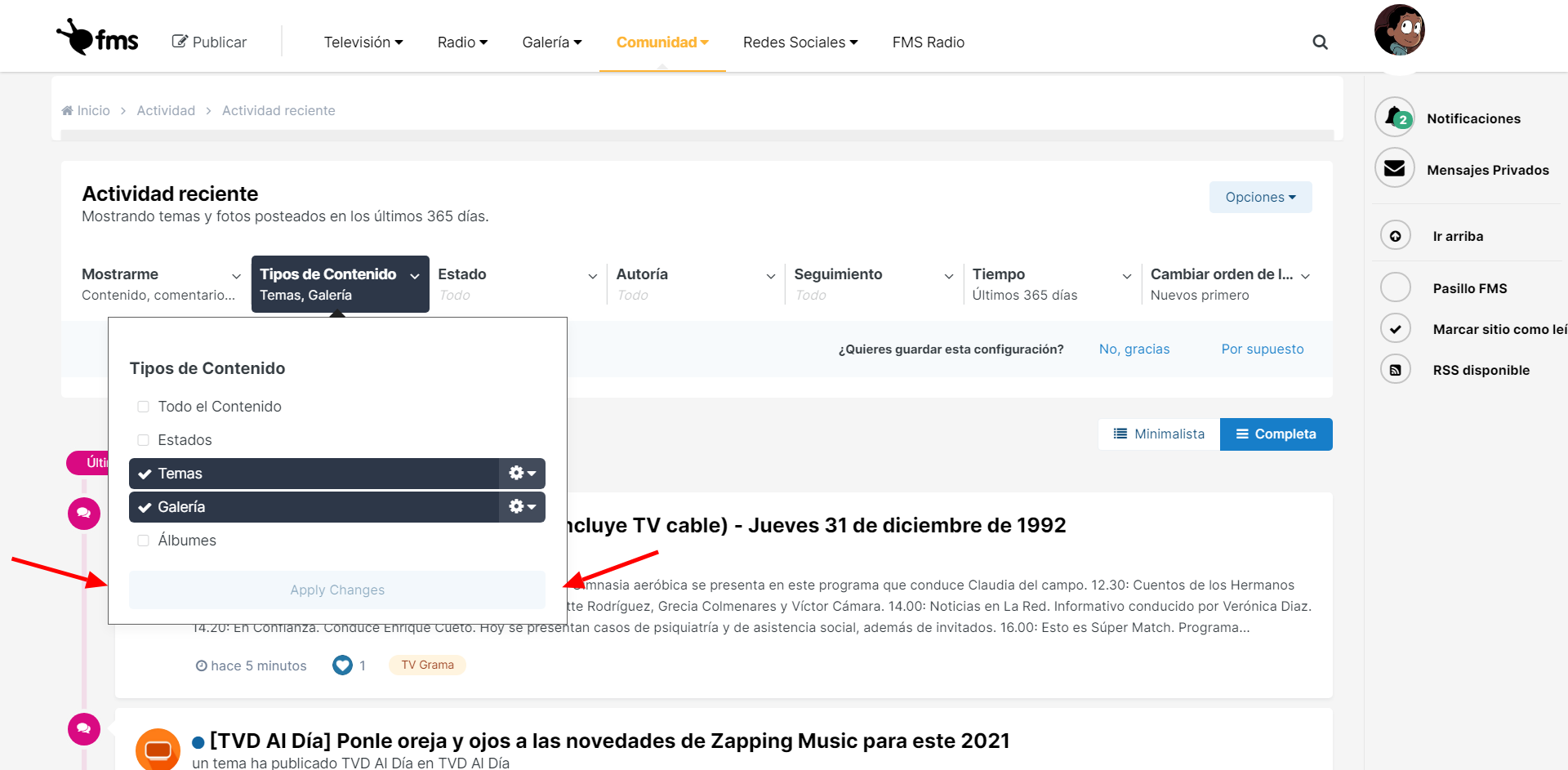 Comunidad > Actividad en tiempo real (Actividad reciente) > Menú dropdown de Tipos de Contenido.