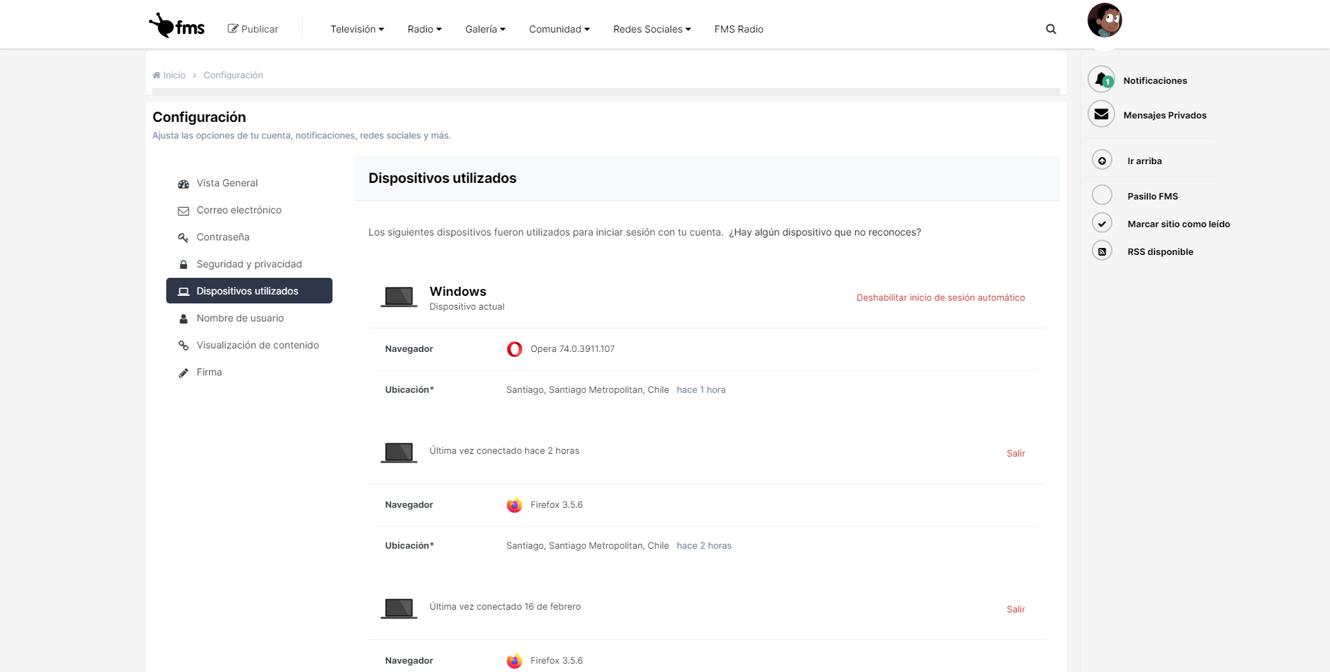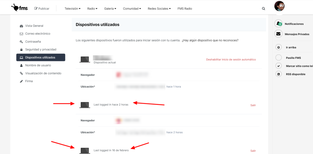 Configuración de usuario > Dispositivos utilizados