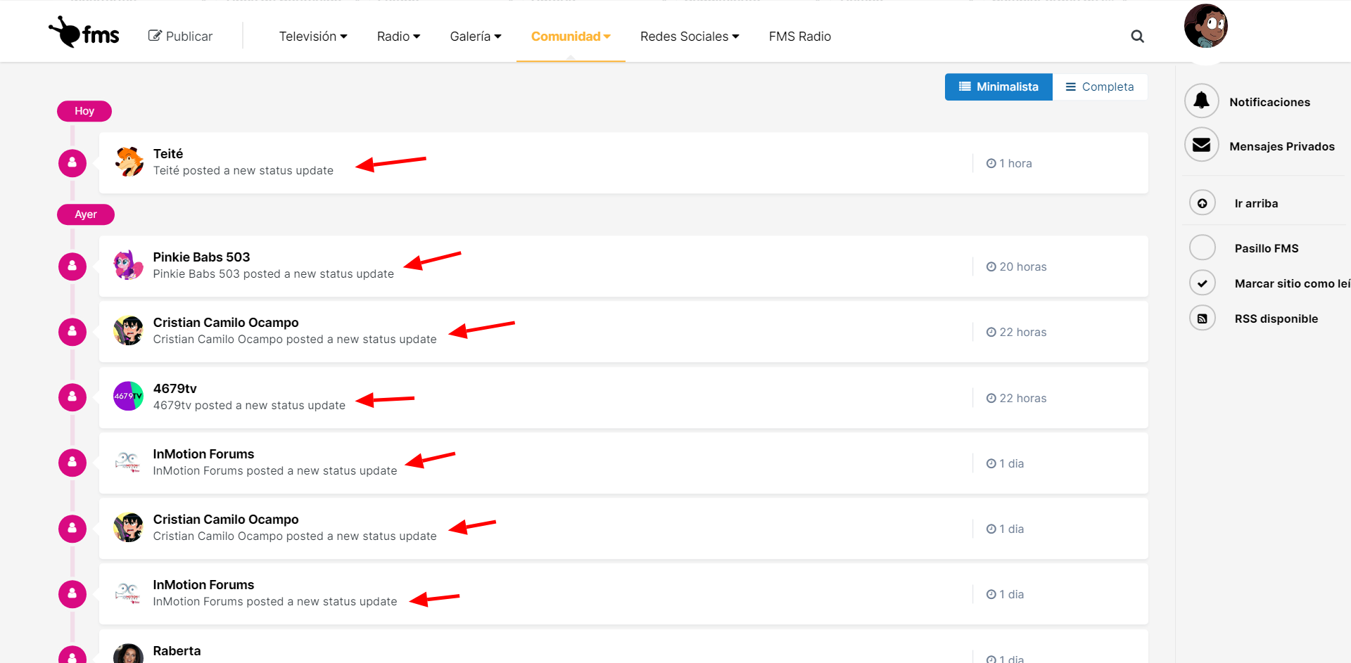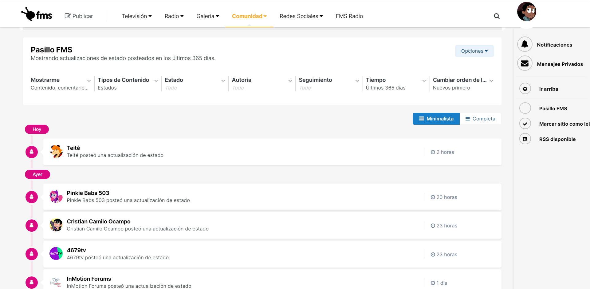 Comunidad > Actividad en tiempo real (Actividad reciente) > Menú dropdown de Estado