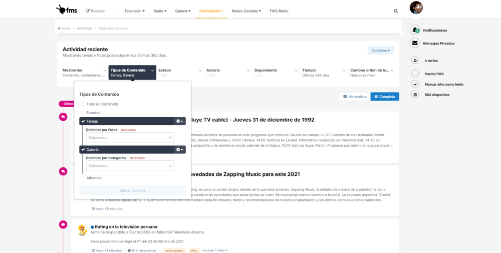 Comunidad > Actividad en tiempo real (Actividad reciente) > Menú dropdown de Tipos de Contenido