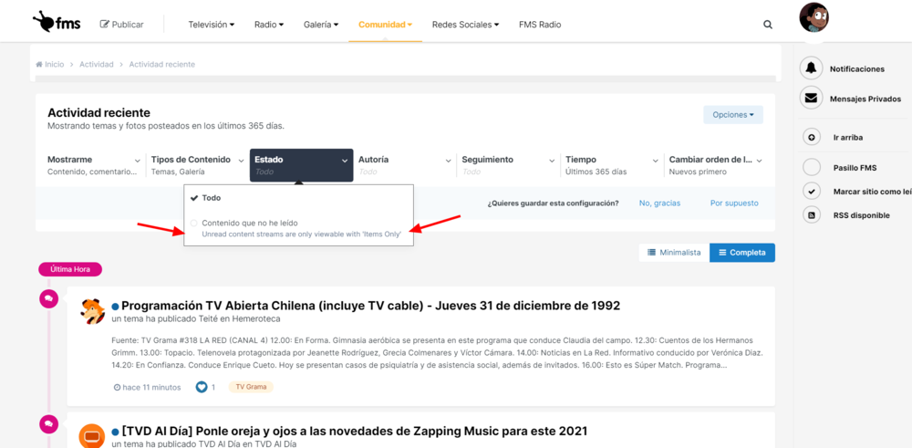 **Texto que acompaña al radio button de "Contenido que no he leído"**