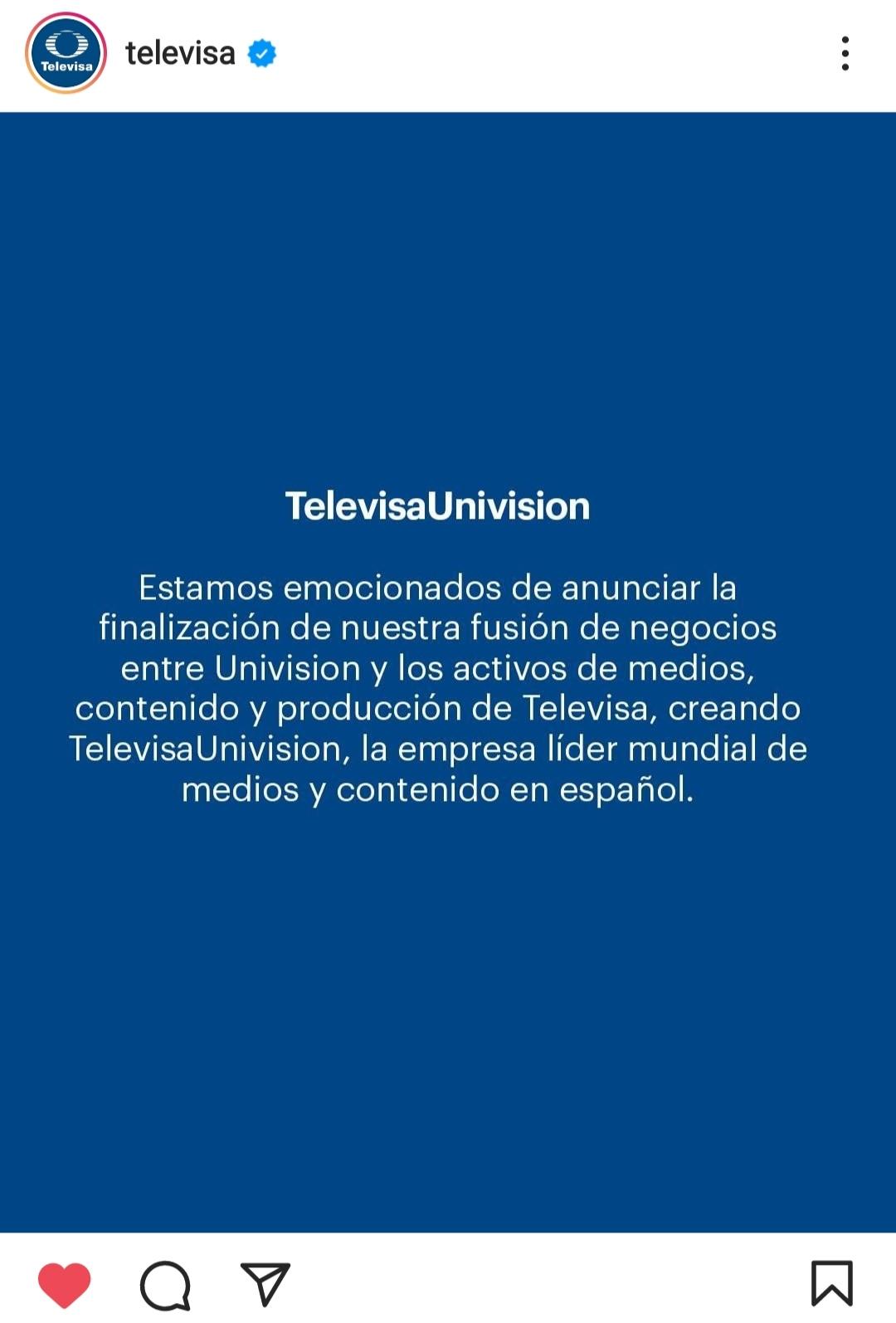 Televisa anuncia en redes sociales el nacimiento de TelevisaUnivision desde hoy. Se puede ver qué existe una web corporativa https://corporate.televisaunivision.com/press/press-releases/2022/01/31/univision-and-televisa-complete-transaction-to-create-televisaunivision-the-worlds-leading-spanish-language/
