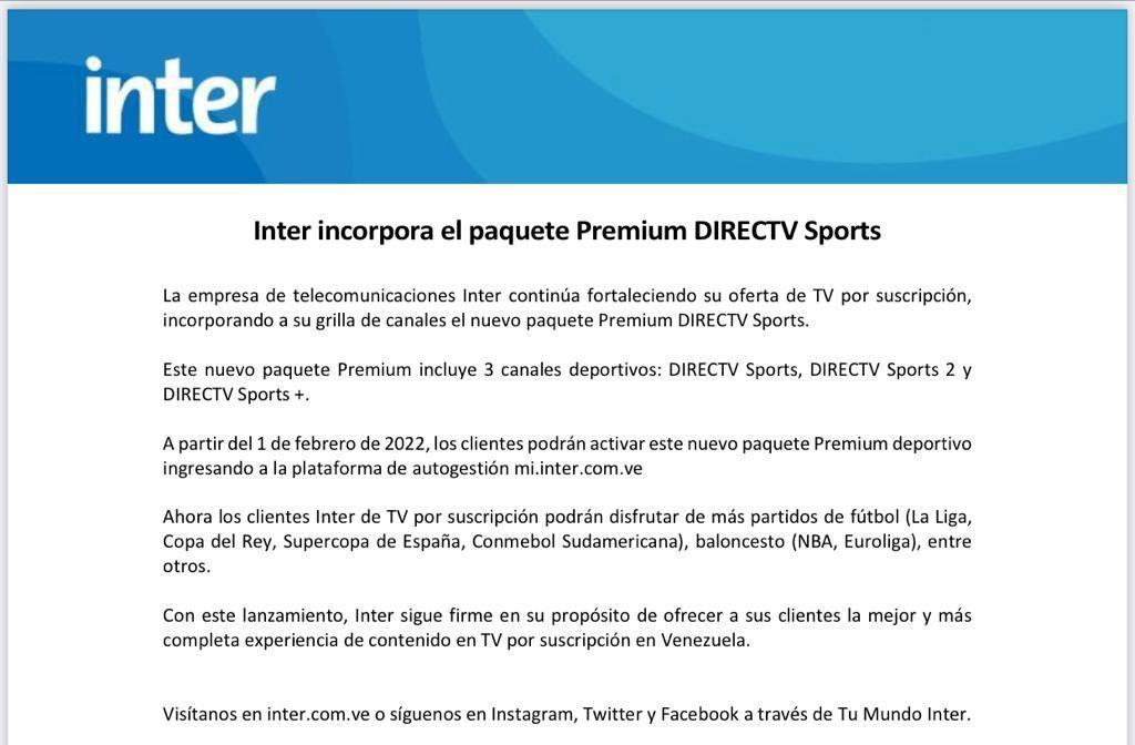 La Empresa Inter Venezuela acaba de Anunciar de Manera Oficial en el día de Hoy Martes 01 de Febrero de 2022 la Incorporación de los 3 Canales Propios de DirecTV qué son : DirecTV Sports, DirecTV Sports 2 y DirecTV Sports + Tanto en Calidad SD cómo en Calidad HD, y va Hacer un Paquete o Plan Premiun aparte, Hasta el Momento se Desconoce el Precio de Dicho Paquete.