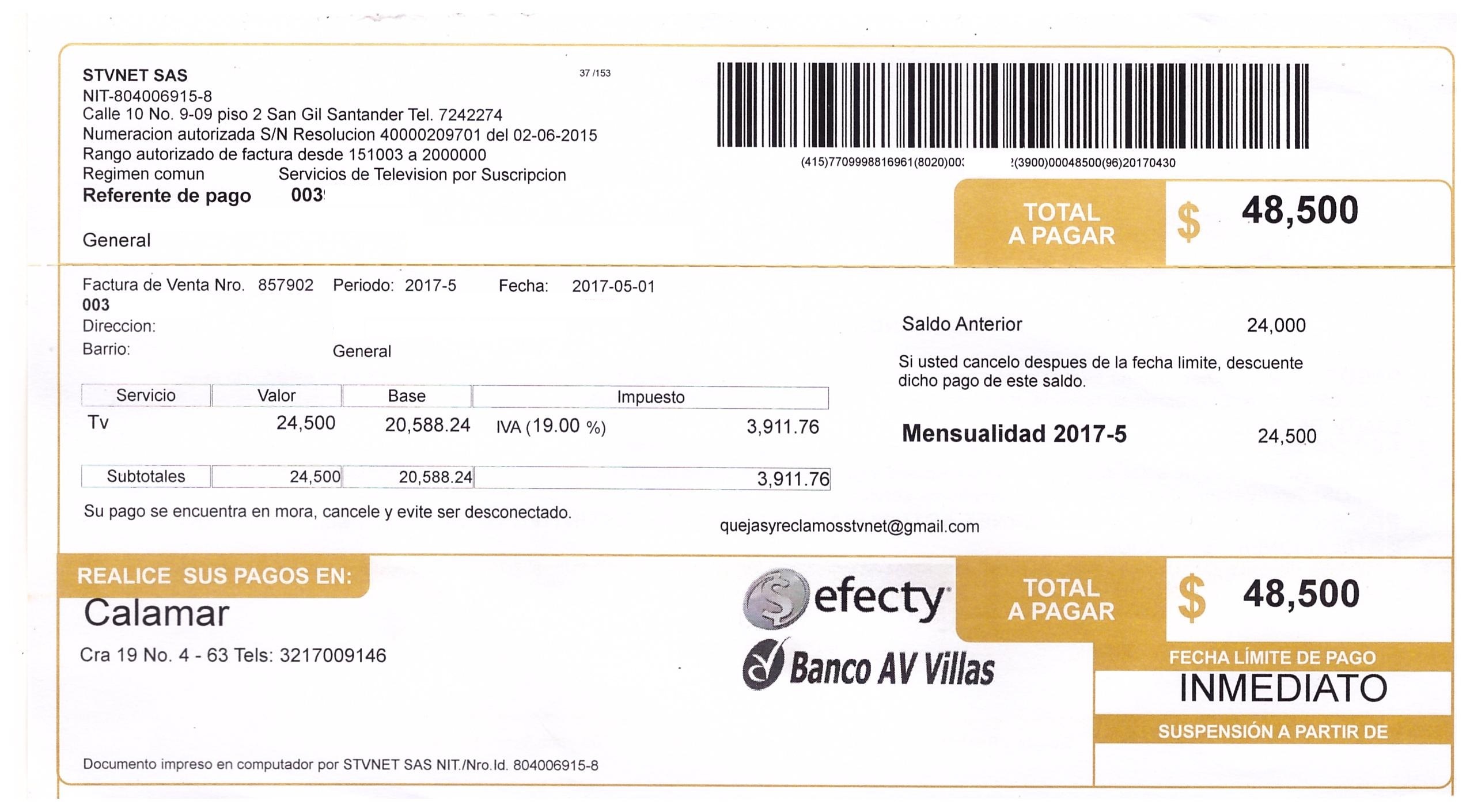 El diseño o formato de la factura viene desde el tiempo en que Global TV Comunicaciones estaba trabajando, Protelco también siguió utilizando el mismo formato y actualmente STV NET continúa con la misma factura.