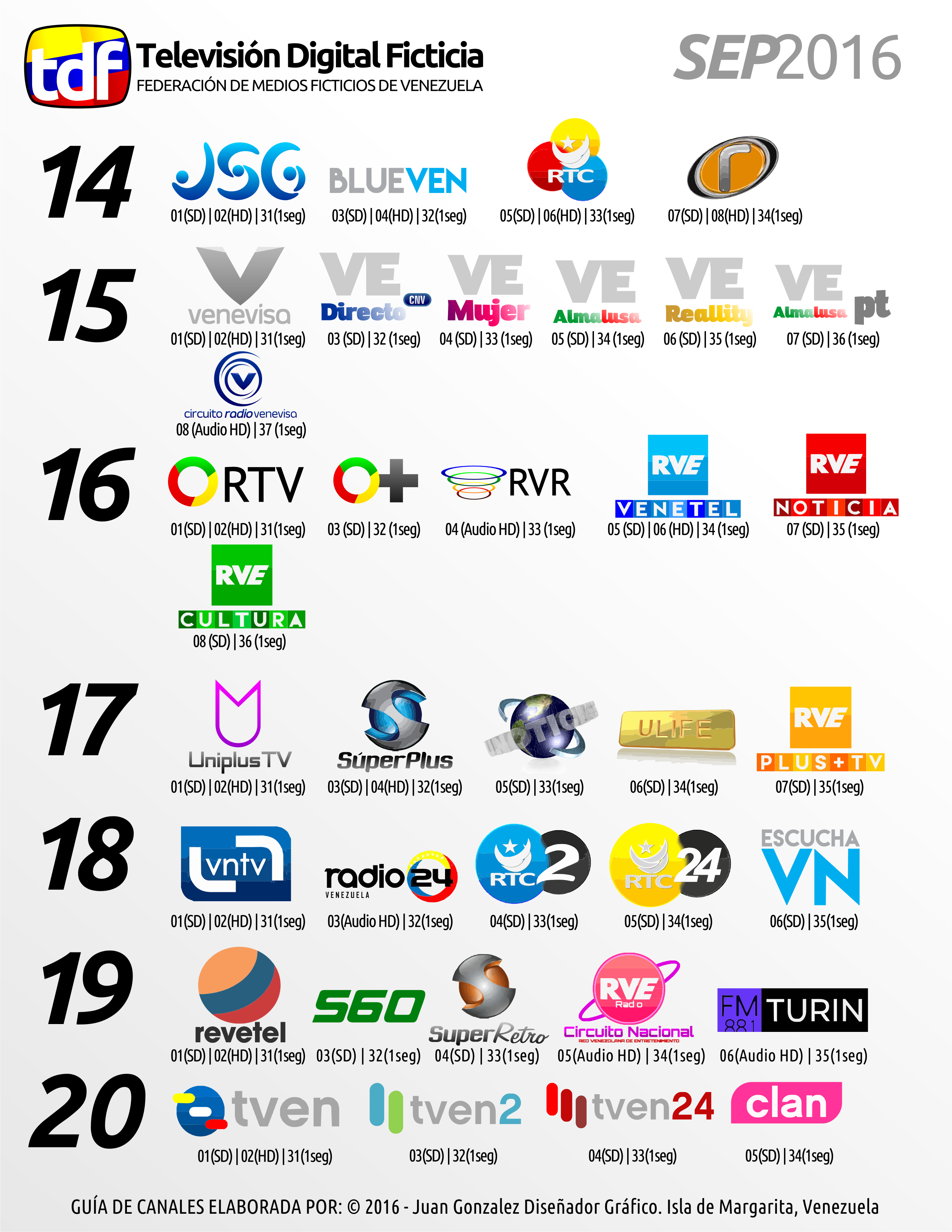 Conozca desde aqui la oferta de canales de televisión ficticia de Venezuela incorporados en la Televisión Digital Abierta, el cual en su reciente lista presenta dos emisoras de radio ficticia en audio HD Via Satélite desde sus matrices en Caracas, al mas puro estilo que la TDT Española.