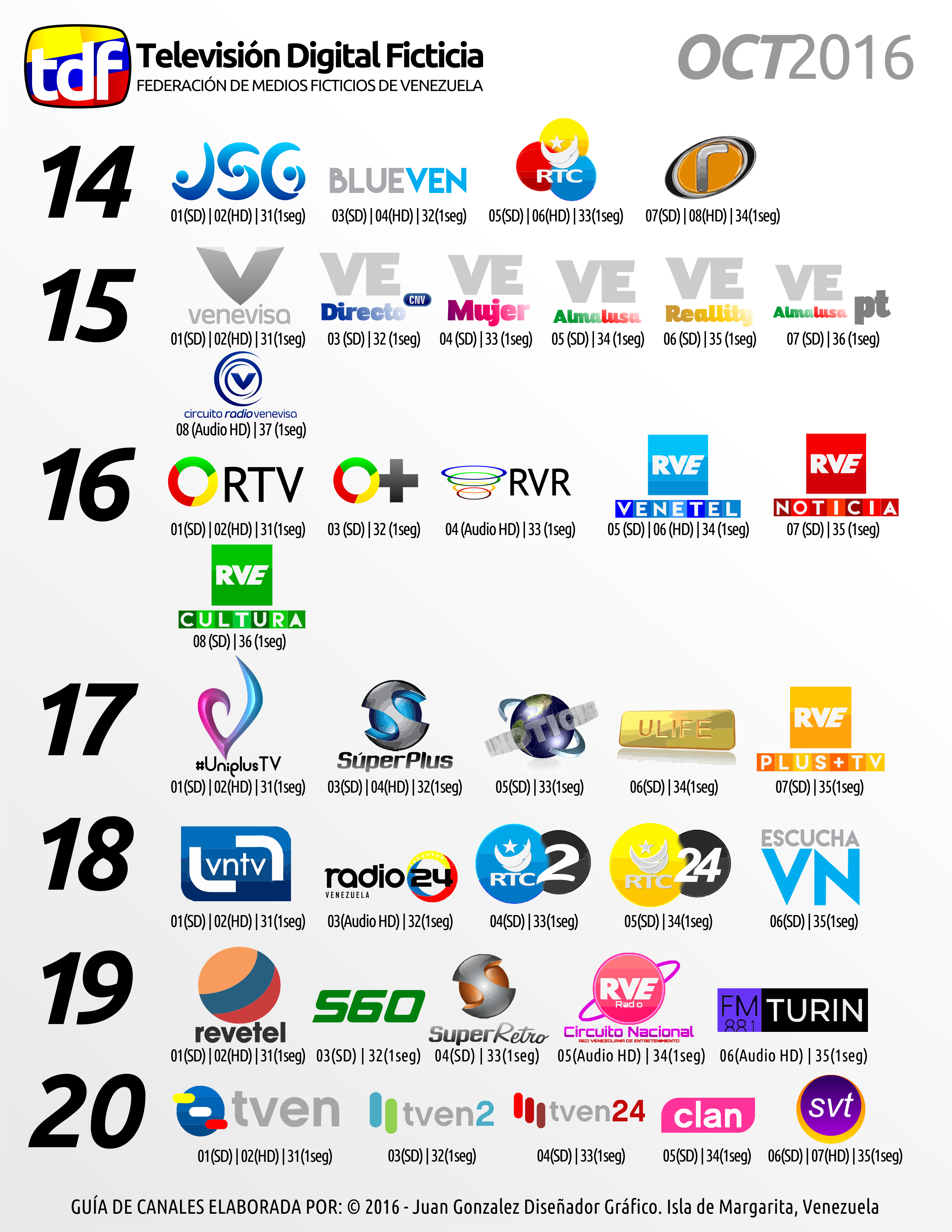 fictiven le da la bienvenida a #SVT (Sistema Venezolano de Televisión. SVT oficial en YouTube), propiedad del colega Reni Jimenez, al mundo de la #TDFVzla por los canales 20.6 (SD 16:9 480p), 20.7 (HD 16:9 720p) y 20.35 (1seg para teléfonos móviles). También le damos la bienvenida a la nueva imagen de #UniplusTV, canal ficticio propiedad del colega José Natera. Haremos el intento por buscar nuevas frecuencias libres en el espectro radioeléctrico para montar otros multiplexos mas. Somos Venezuela, somos FICTIVEN!!!