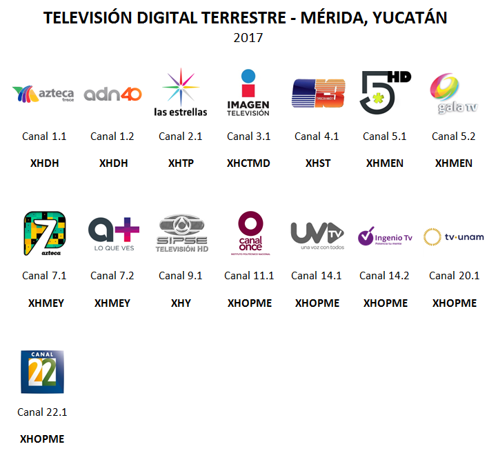 Estos son los canales que son emitidos a través de la **Televisión Digital Terrestre** siendo el día **24 de Septiembre de 2017 **en la ciudad de **Mérida, Yucatán**, y área metropolitana.