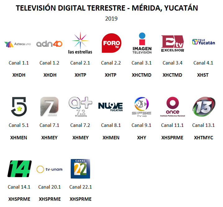 Estos son los canales que son emitidos a través de la **Televisión Digital Terrestre** siendo el día **24 de Septiembre de 2019** en la ciudad de **Mérida, Yucatán**, y área metropolitana.