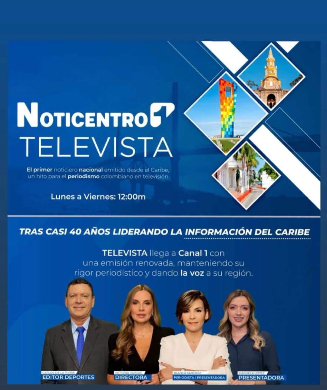 Un noticiero regional que estuvo hasta septiembre del año pasado en Telecaribe será un noticiero nacional que llegará al Canal 1, se trata del Noticiero Televista que se llamará Noticentro 1 Televista que estará al aire en esta señal a partir del 1o. de Julio.