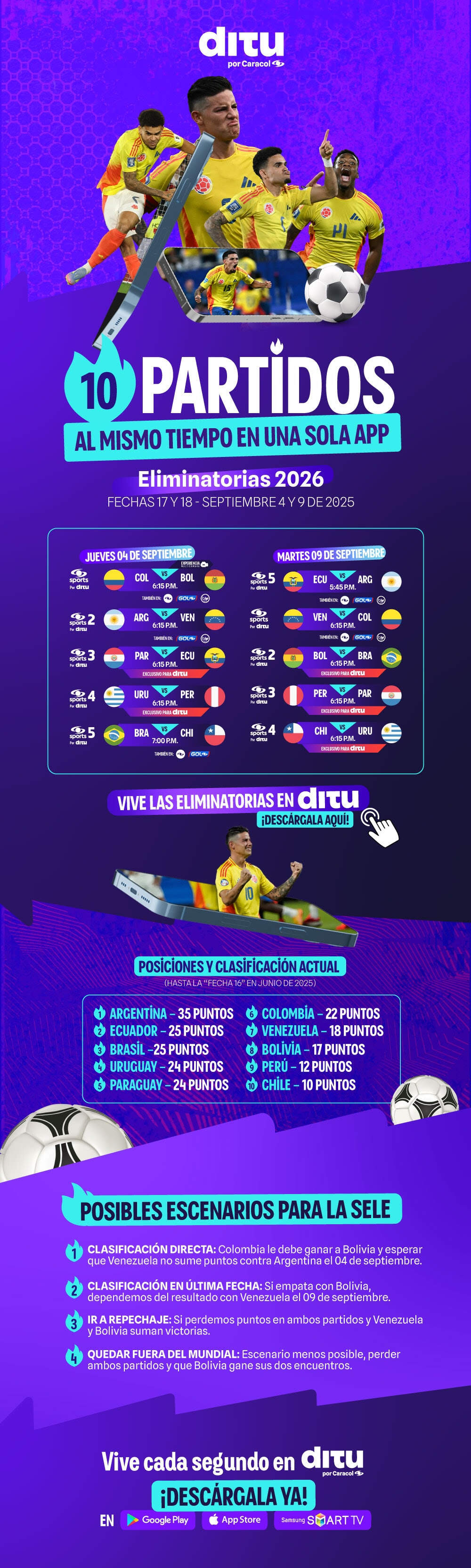 ditu, la app de streaming de Caracol Televisión, pondrá a disposición del público el desenlace de toda la eliminatoria de CONMEBOL rumbo a la cita mundialista de 2026. Estos son los horarios y canales de las dos fechas. Por primera vez en Colombia, estas transmisiones se ofrecerán en Dolby y Dolby Atmos para una mejor experiencia de audio envolvente.