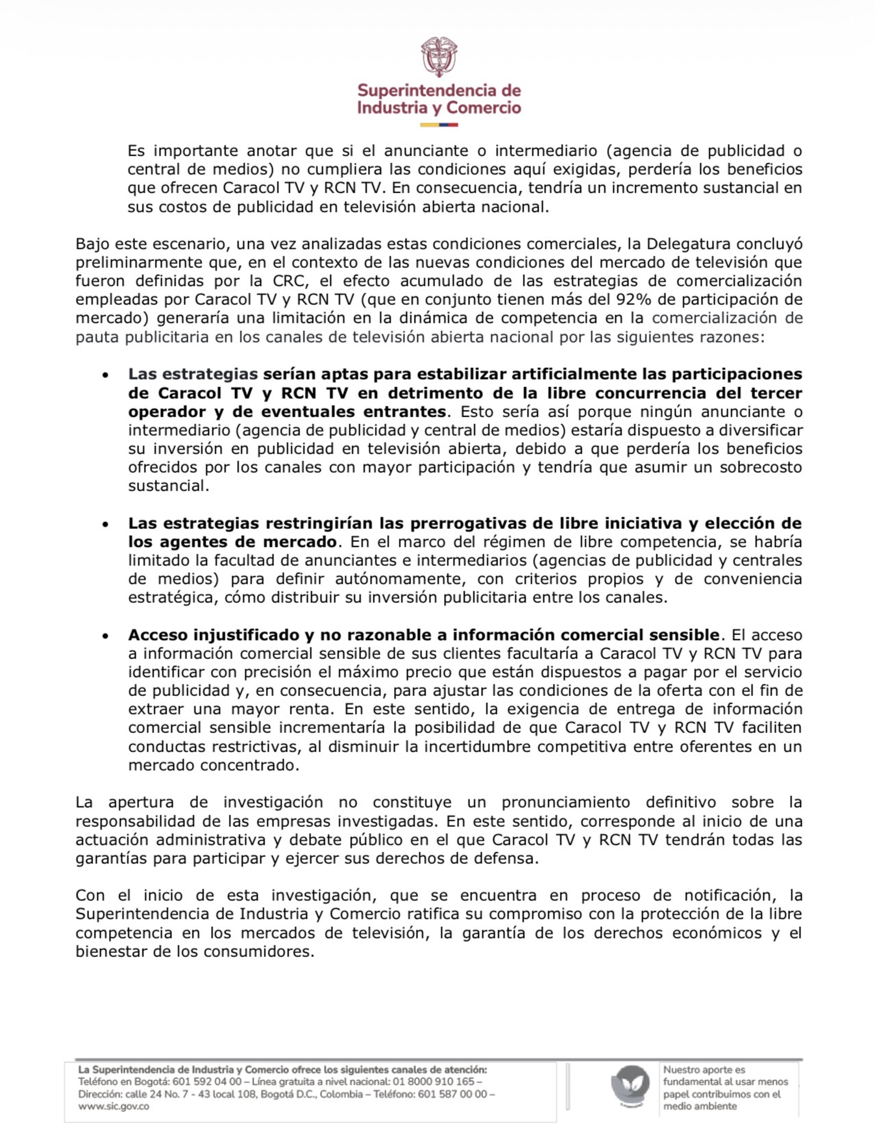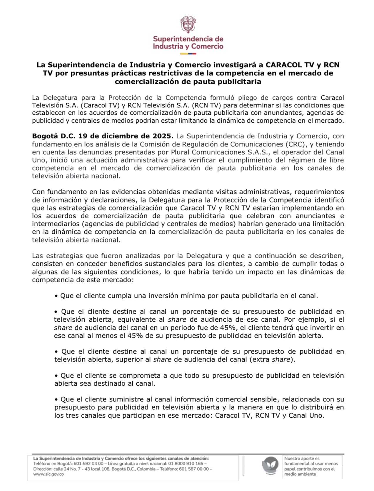 La Superintendencia de Industria y Comercio ordenó investigación y formuló pliego de cargos contra los canales privados nacionales de televisión abierta Caracol Televisión y RCN Televisión por restricciones en cuanto a pauta publicitaria.