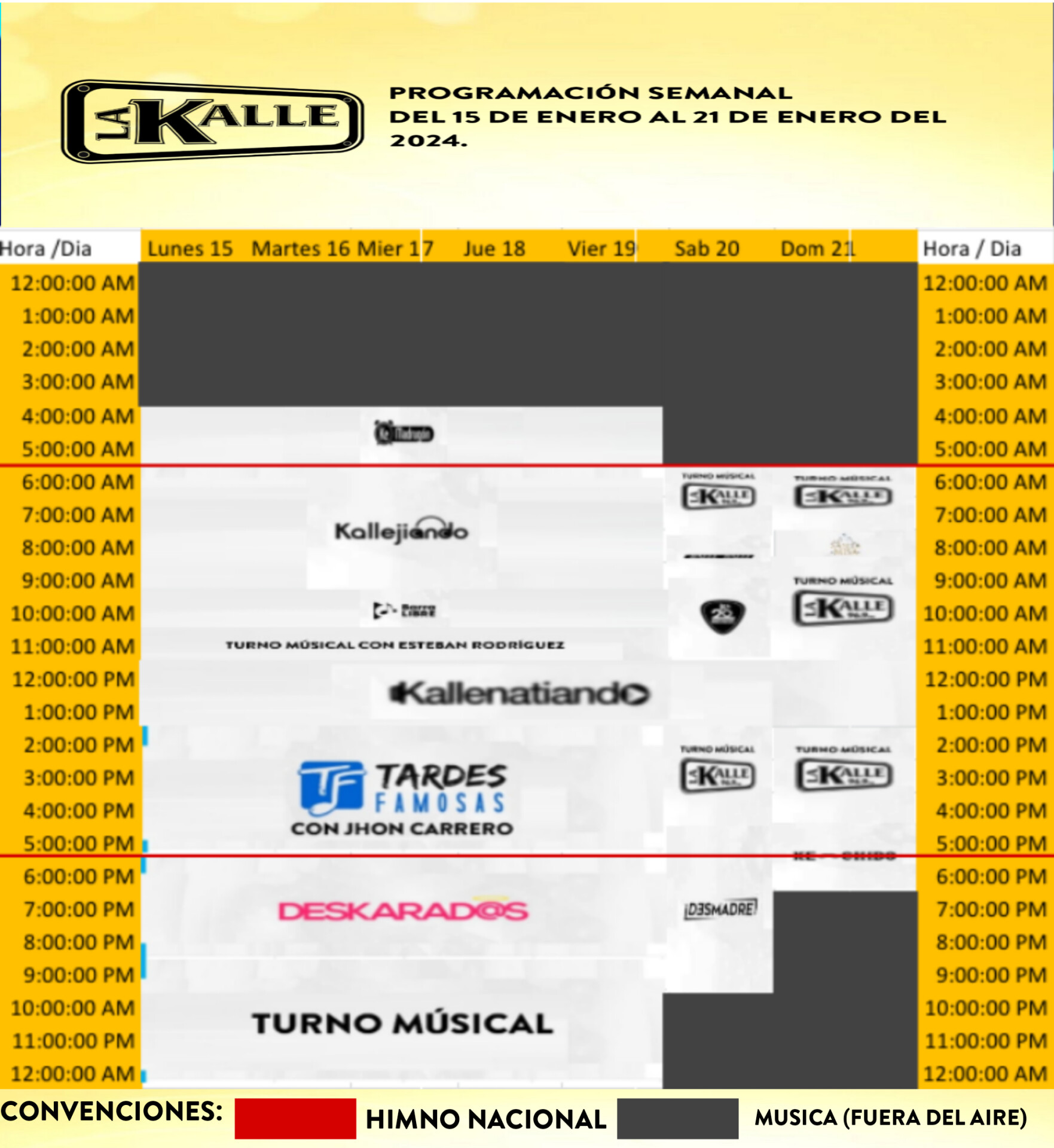 Programación Semanal De la Emisora - Canal musical La Kalle está es la programación para Todos los días Xd Cómo ustedes ven La Línea Roja es el espacio del Himno nacional de Colombia y lo Gris Es El espacio de ningún programa como por ejemplo, Un Fuera del aire de solo música