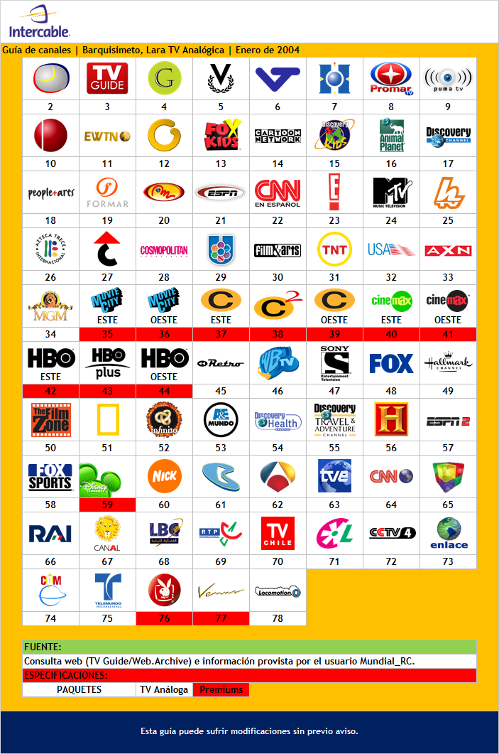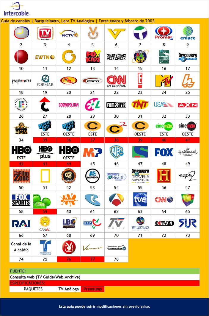 En algún punto de 2003 hubieron unos cambios en la grilla (reflejados en un Archive de finales de ese año), NCTV Lara quebró ese mismo año y su lugar lo cubríó Elgourmet(punto)com que también ingresaba en el resto del país, Telecentro fue temporalmente retirado por el Canal 24 Horas de TVE, ingresaba Puma TV en el 9 mientras Enlace TBN cubría el hueco de SUR/Mundovisión, Cine Latino como Multipremier fueron reemplazados por Utilísima y Retro respectivamente aunque CL siguió en la grilla en el lugar de la Globo y MP no regresó hasta uno de los primeros grandes reordenamientos a mediados de 2004 cuando comenzaron a reducir la oferta codificada del analógico (y en paralelo empezaron con la grilla de la TV digital con decodificador) y empezaron a agregar los primeros canales de la “hegemonía comunicacional” post-Paro Petrolero (aka el canal Vive, luego ANTV o TeleSUR), ah, y el “Canal de la Alcaldía” lo reemplazaría por un tiempo la Cadena del Milagro, todo según los apuntes que tengo.