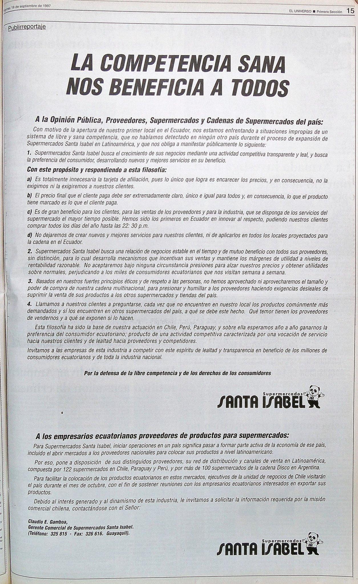 Ahora para finalizar luego de 2 horas o eso creo de escribir esto les traigo un reportaje de reporte semanal del año 2004 sobre santa isabel y la discriminación en sus locales les recomiendo verlo ya que aparecen interiores y exteriores de difentes locales de la cadena el local de San Miguel, Los Olivos y Av. 2 de Mayo en Santa Isabel también descárguenlo puede ser que lo borren. Gracias por haber visto todas estas primicias nos vemos hasta que encuentre más primicias los quiero por parte del osito Santa Isabel