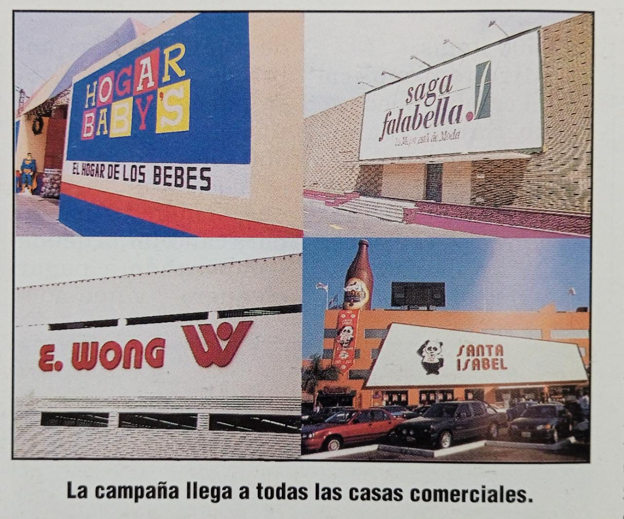 Un conjunto de tiendas variadas: un espacio de Hogar (orientado a bebés), Saga Falabella de San Isidro con su primer logo, Santa Isabel de San Borja y un Wong que no saco aún qué local es, pero se debate entre el de Corpac (desaparecido) y San Borja.