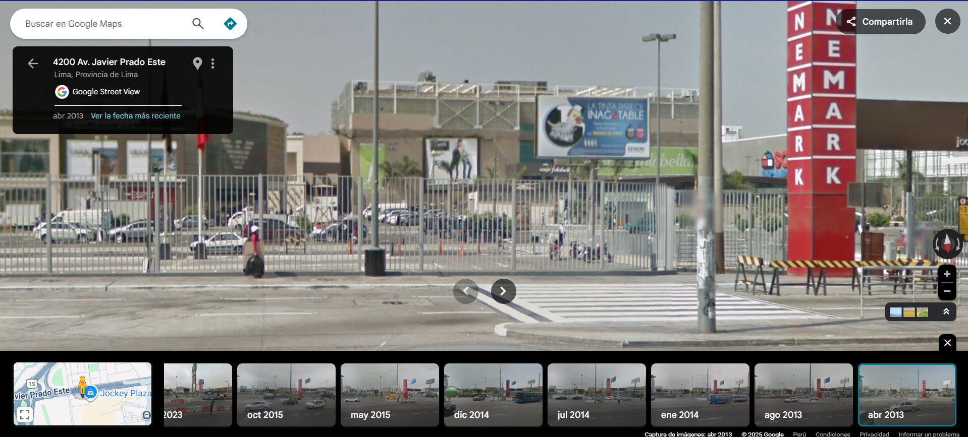 No soy yo o en esta imagen sacada de un video de la av Javier Prado en octubre de 2010 se vé a Saga Falabella del Jockey Plaza en plena remodelación de fachada donde se vé las letras de la anterior fachada que estuvo desde 1997, tan solo vean la similitud.