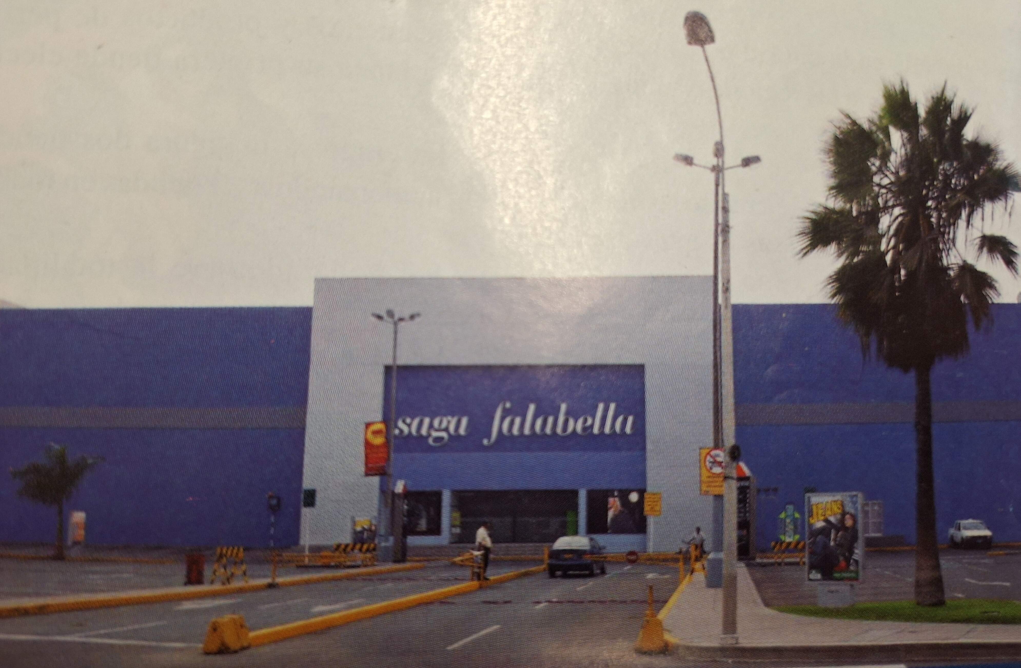 Las departamentales chilenas Saga Falabella y Ripley frente a frente en sus locales de la calle Las Begonias en San Isidro, aprox. en el año 2004 cuando Saga ya tenía su fachada de vidrio y logo colocados, y Ripley seguía con su local gris que entre octubre y noviembre pasaría a ser del actual blanco.