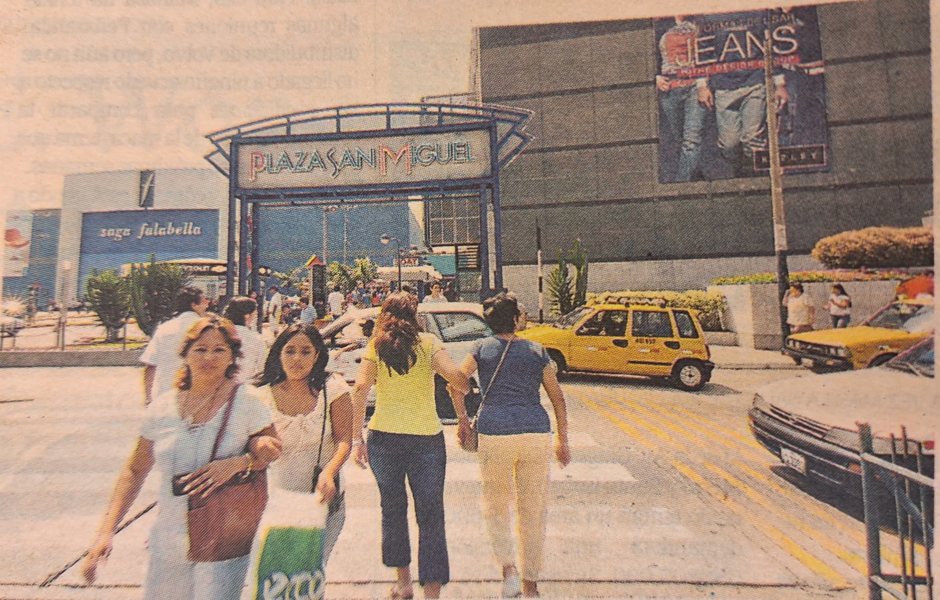 Entrada a Plaza San Miguel a inicios de 2005, resaltando las antiguas fachadas de Saga Falabella y Ripley.