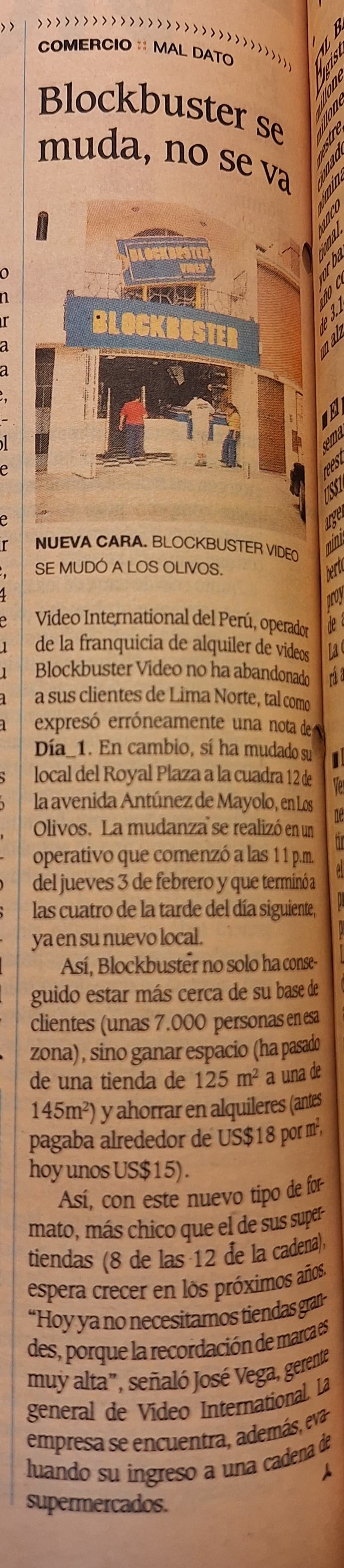 Otro local caleta: por acá se comentó que uno de los primeros Blockbuster en cerrar fue el del Royal Plaza en Independencia, en el año 2005. Sin embargo, parece que en principio se mudaron por un tiempo a la Av. Antúnez de Mayolo en Los Olivos, con un pequeño local que seguro muchos ni recuerdan (como yo). Acá una nota al respecto, con foto incluida.