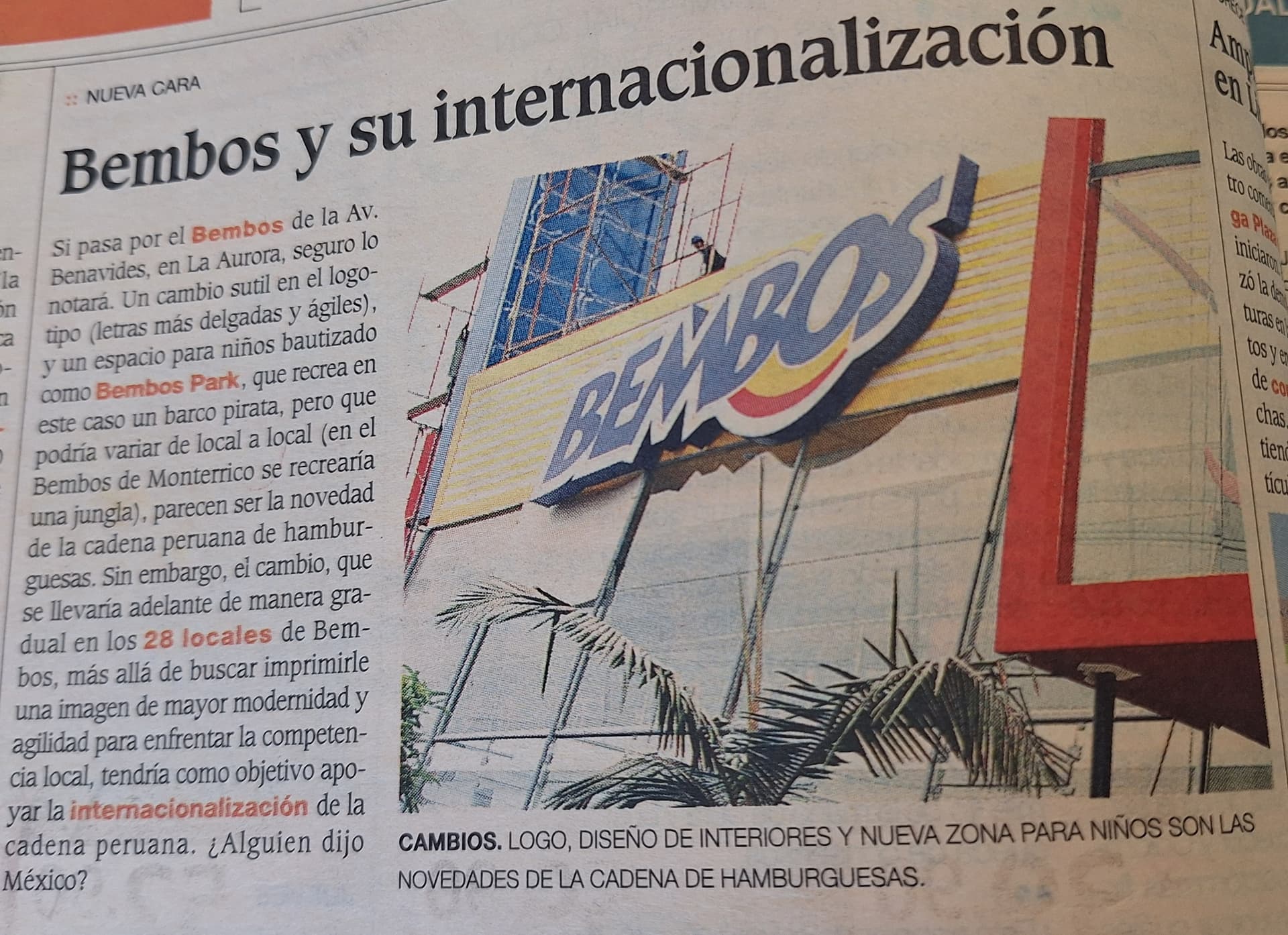 Una nota que revela algo que creo que muchos ignorábamos: el logo curvo-estilizado de Bembos que duró varios años y que aún puede verse en algunos locales fue lanzado a finales del año 2004 y no en 2005 como se solía creer. El local de Aurora (Miraflores) fue uno de los primeros en recibir el cambio.
