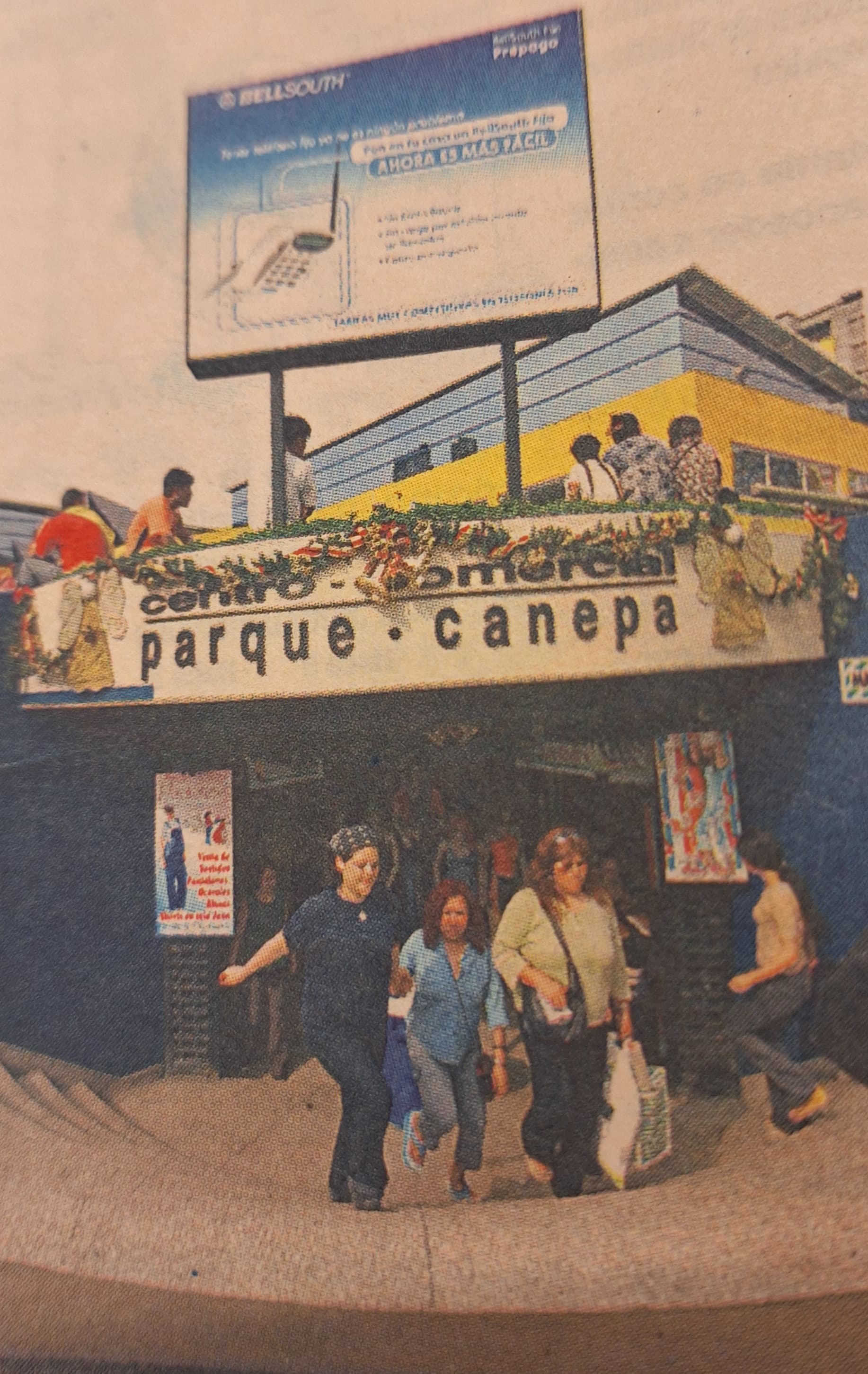 Entrada del centro comercial Parque Cánepa en la zona de Gamarra (La Victoria) en el año 2003. Se ve un letrero del servicio de telefonía fija de la desaparecida Bellsouth.