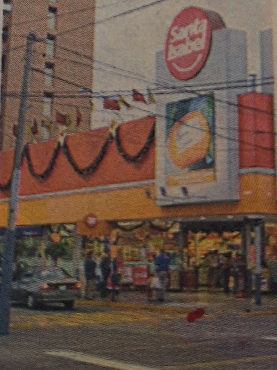 El Metro de Emancipación por el lado del Jirón Lampa y una foto de su interior (aparentemente) aprox. en el año 2004. Por cierto, la nota original hablaba de que se buscaba repotenciar el Metro de la UNI, pues era el local de ingresos más bajos de la cadena. Ya por entonces estaba con problemas, hasta que el año pasado no dio más. (Ojo: la foto de la fachada fue retocada por baja calidad inicial, no es óptima pero a nada).