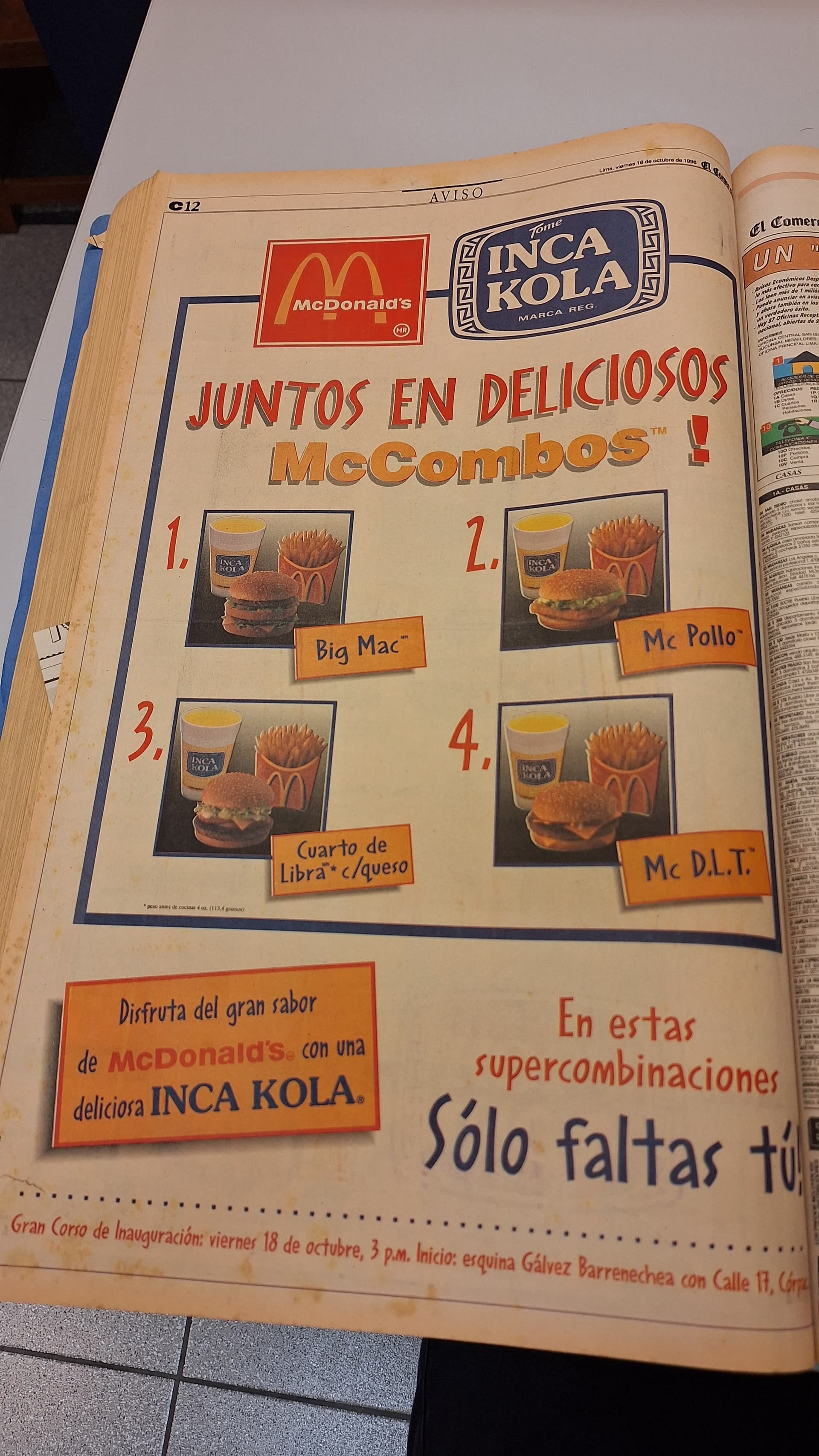 Un anuncio en colaboración con Inca Kola. Esto demuestra, por cierto, que McDonald’s y la gaseosa nacional estuvieron en asociación desde el primer día, y por 29 años seguidos.