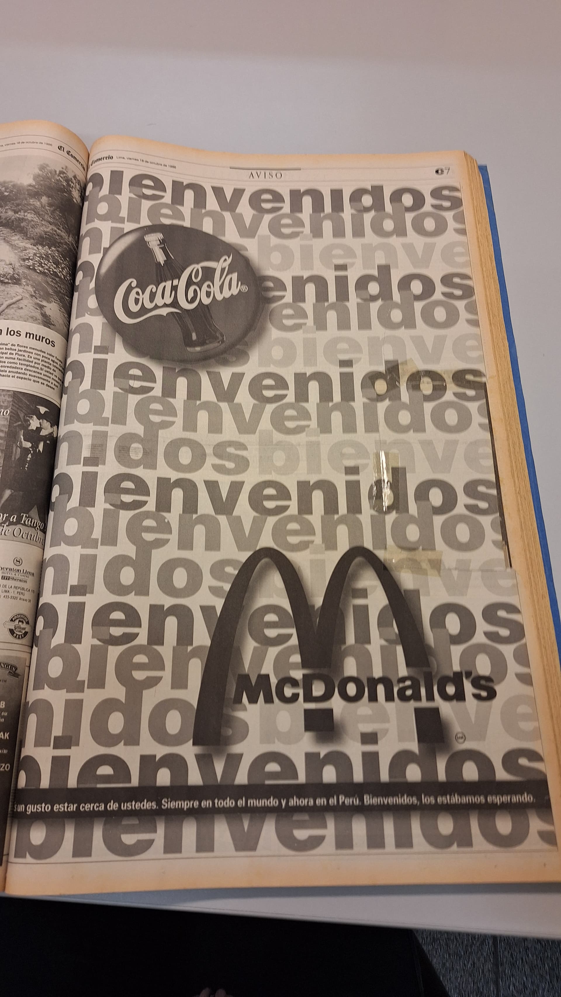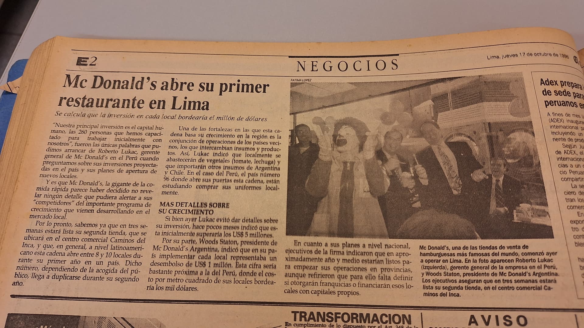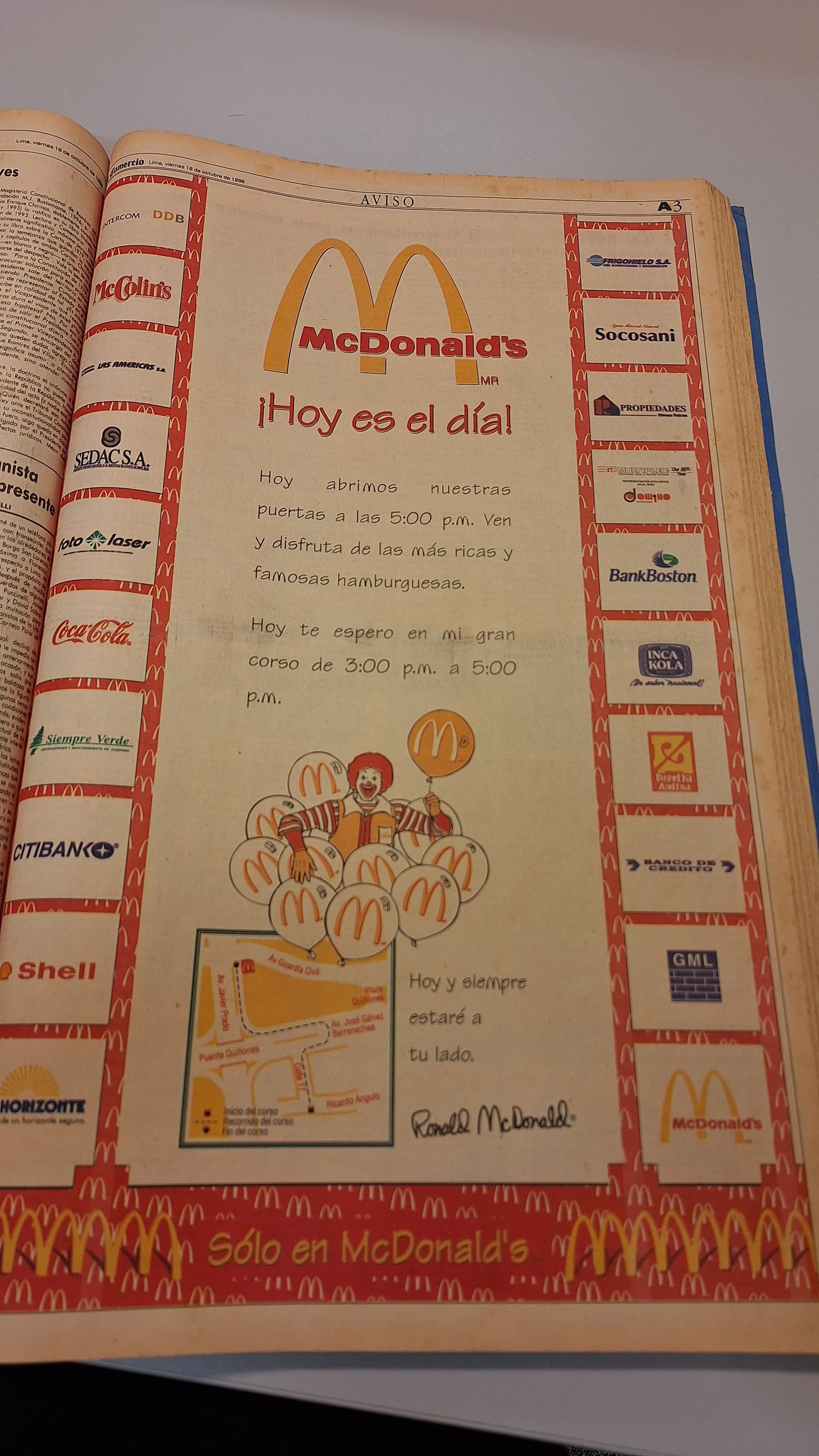 Hace 29 años la cadena más reconocida de comida rápida llegó a nuestro país. Por ello, les pasaré los avisos que salieron en el Comercio durante esa semana de octubre de 1996 que se dio la apertura.