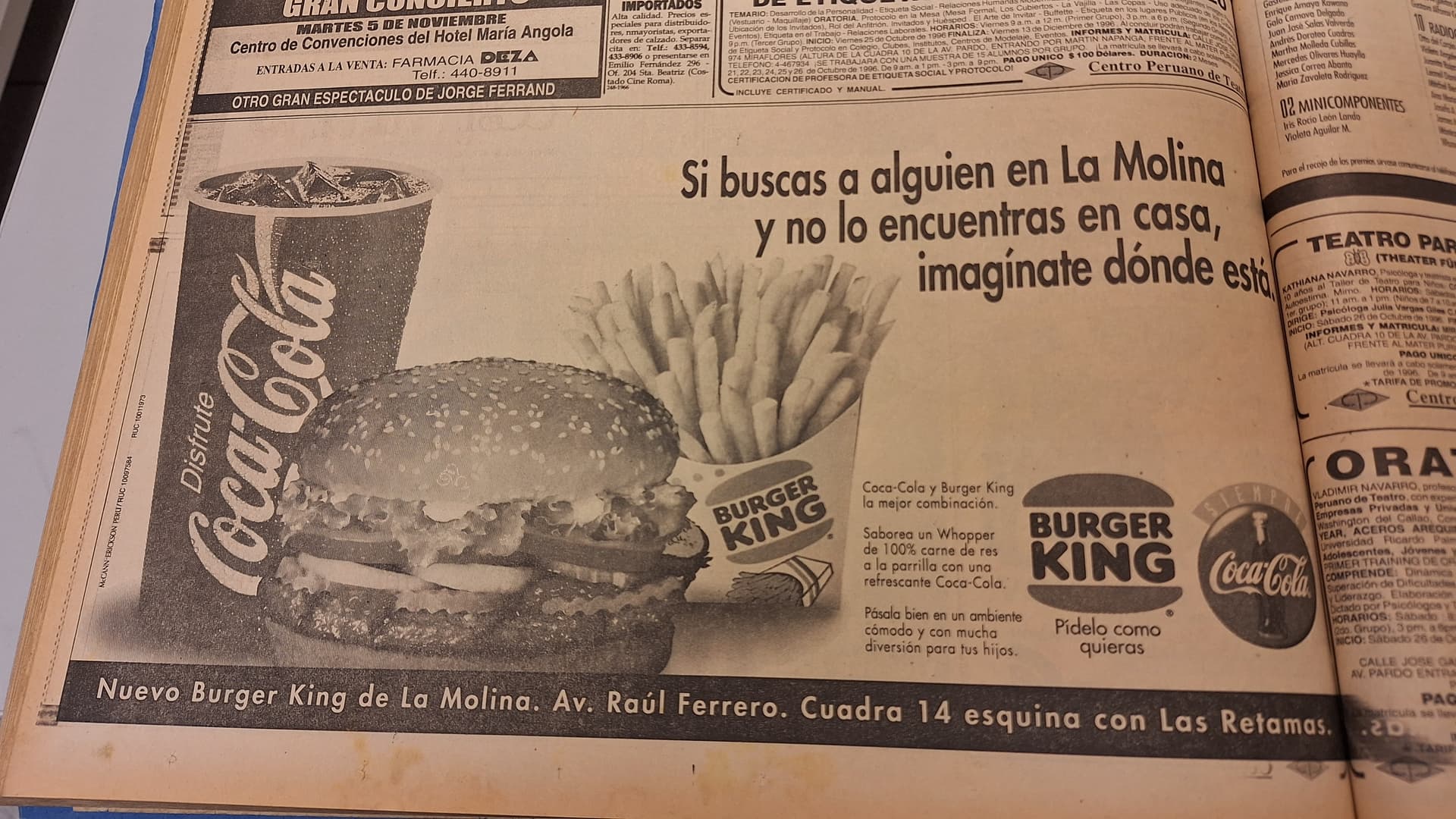Como bonus track, les dejo un anuncio de la apertura de su rival Burger King en la Av. Raul Ferrero (La Molina) en la misma semana de octubre de 1996. Se trataba del octavo local de la cadena en general. Este se transformó al abrir el Molina Plaza en 2005, y de momento lleva cerrado un buen tiempo junto con sus pares de Delosi, todavía sin pistas de una reapertura que habían dicho. McDonald’s recién llegó a la zona en 2012 y acabó yéndose también en 2020.