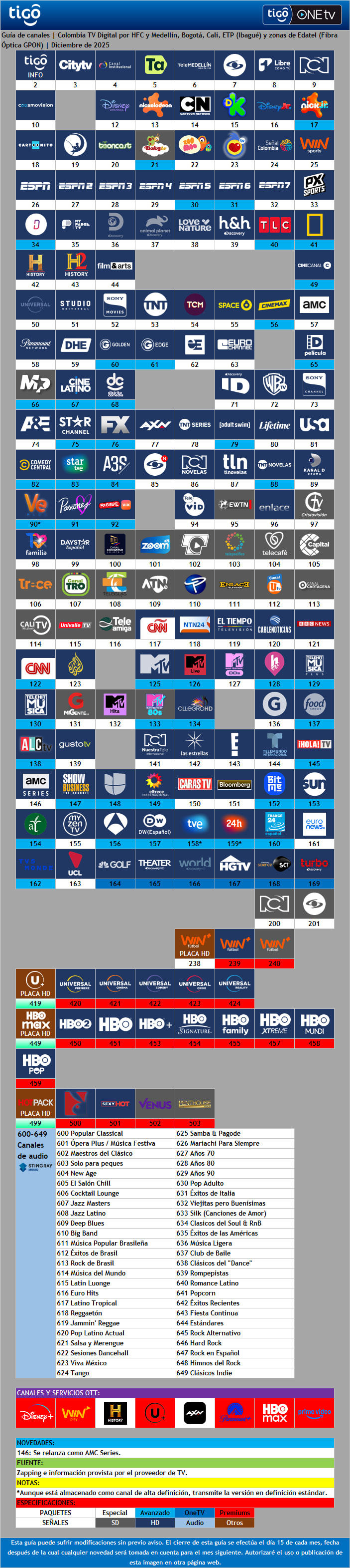 Con respecto a Tigo en TV Especial, Avanzado y OneTV, el canal Paramount Network en el canal 58 se va de la grilla, lo que se mantendrá es MTV Latam, en el canal 125, Nickelodeon en el canal 13 NickJR en el Canal 17, Comedy Central en el Canal 82 y los que se va de la grilla es TeenNick en el canal 310, 1310 y 234 en Satelital, MTV 00’s en el canal 127, MTV Live en el canal 126, MTV 80’s en el canal133 y MTV Hits en el canal 132 previsto para el 31 de diciembre o por mas tardar el 1 de enero de 2026.