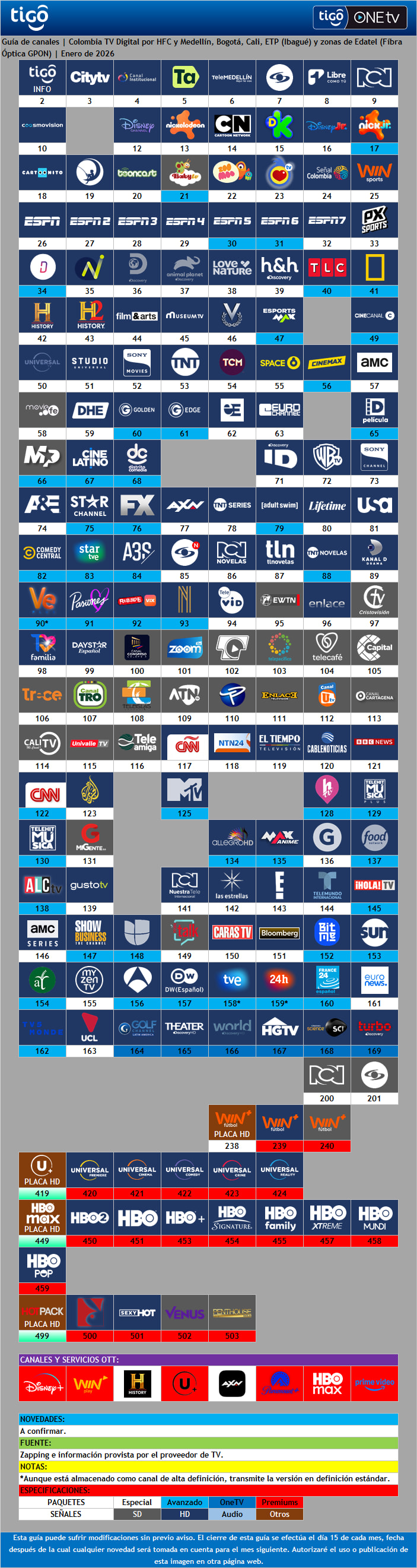 Tigo TV Colombia - Guía de Canales (Enero de 2026)