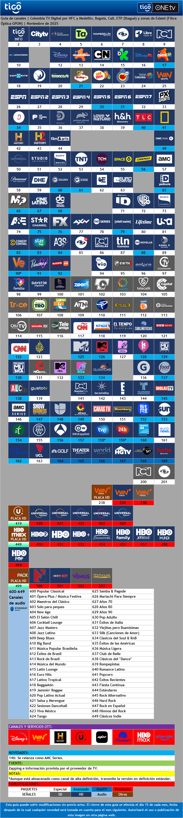 Tigo TV Colombia - Guía de Canales (Noviembre de 2025)