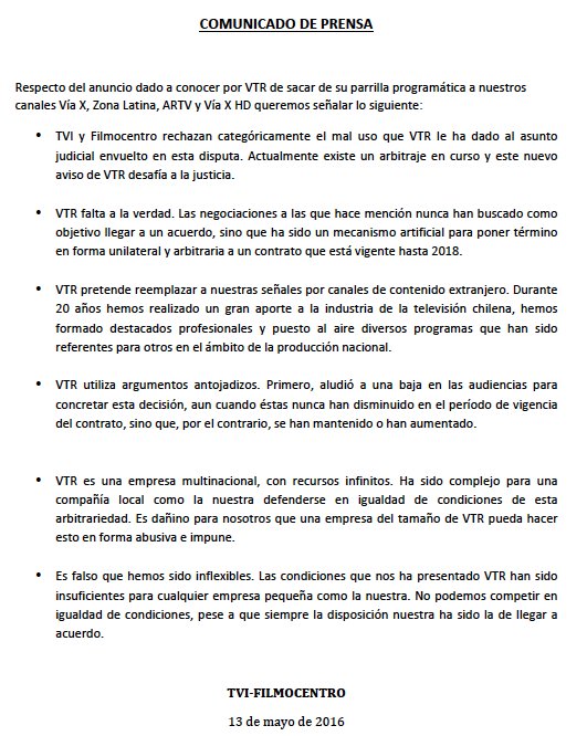 "Las señales de Via X, Zona Latina, ARTV y Via X HD son prácticamente los únicos canales chilenos con contenido local y, pese a que su raiting ha aumentado en los últimos años, VTR quiere igualmente eliminarlos de la grilla para reemplazarlos por canales extranjeros y así reducir sus costos. Esto sería una gran pérdida para la televisión chilena", expusieron Filmocentro y TVI.