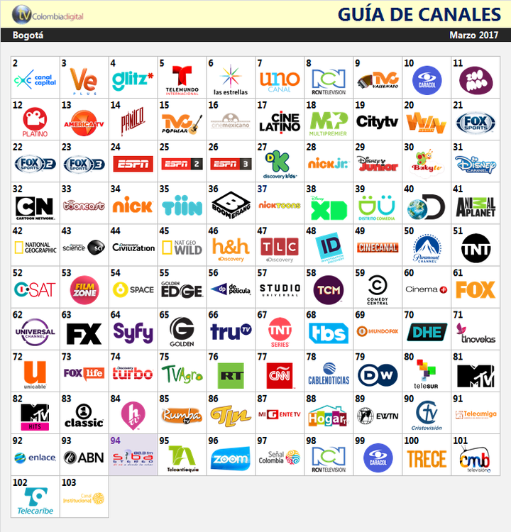 ¿Otra vez, señor? Le dije que la grilla de TV Colombia Digital la publico después del 13 de Marzo ya que va de golpe junto con las grillas de otros operadores cuando se aclare la alineación de Fox Premium. Le garantizo que ya está con el logo de América TV, el canal local de Sibaté y un logo de los canales TVC que adapté ya que no cuento con programas para vectorizar logos a partir de sus capturas.